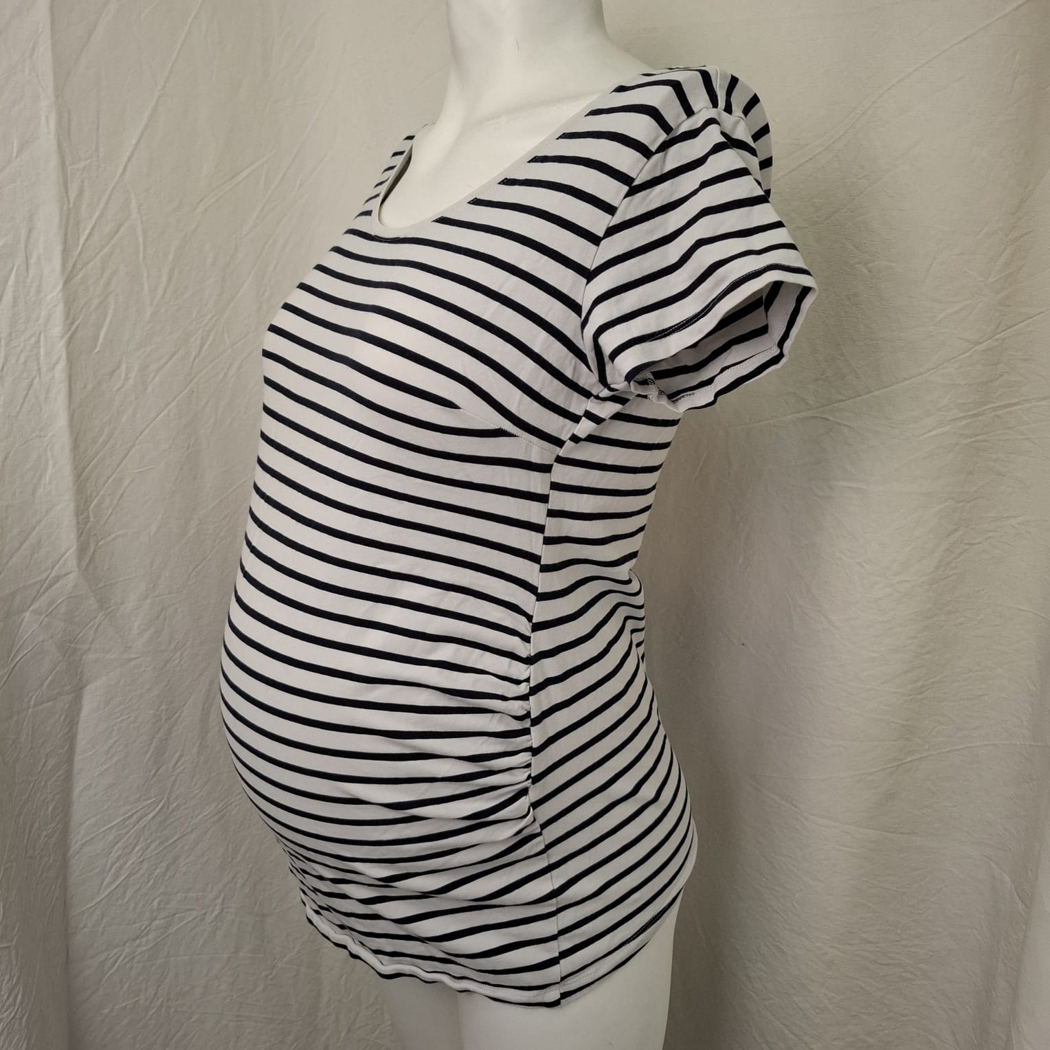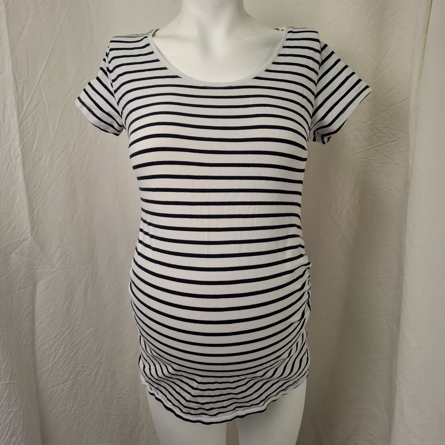 Autres commentaires : Ensemble 2 pièces maternité : – T-shirt marinière à manches courtes, blanc à rayures noires, élastiqué et froncé en latéral pour mieux épouser la forme du ventre, col large arrondi. Taille L – Legging noir, taille élastquée, 95% coton et 5% élasthanne. Taille L.