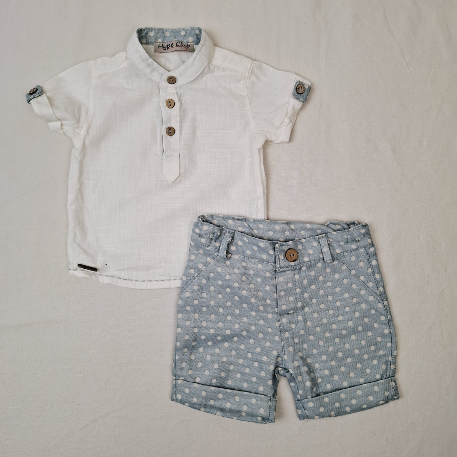 Autres commentaires : Ensemble 2 pièces : – Short à revers bleu ciel à pois blancs, ceinture ajustable par élastique intérieur, fermeture devant par un bouton, 60% polyester et 40% coton. – Chemise blanche assortie, à manches courtes à revers, col officier fermé par 3 boutons, rappel du tissu bleu ciel à pois blanc au niveau des manches et à l’intérieur du col, 100% coton pour le tissu blanc.