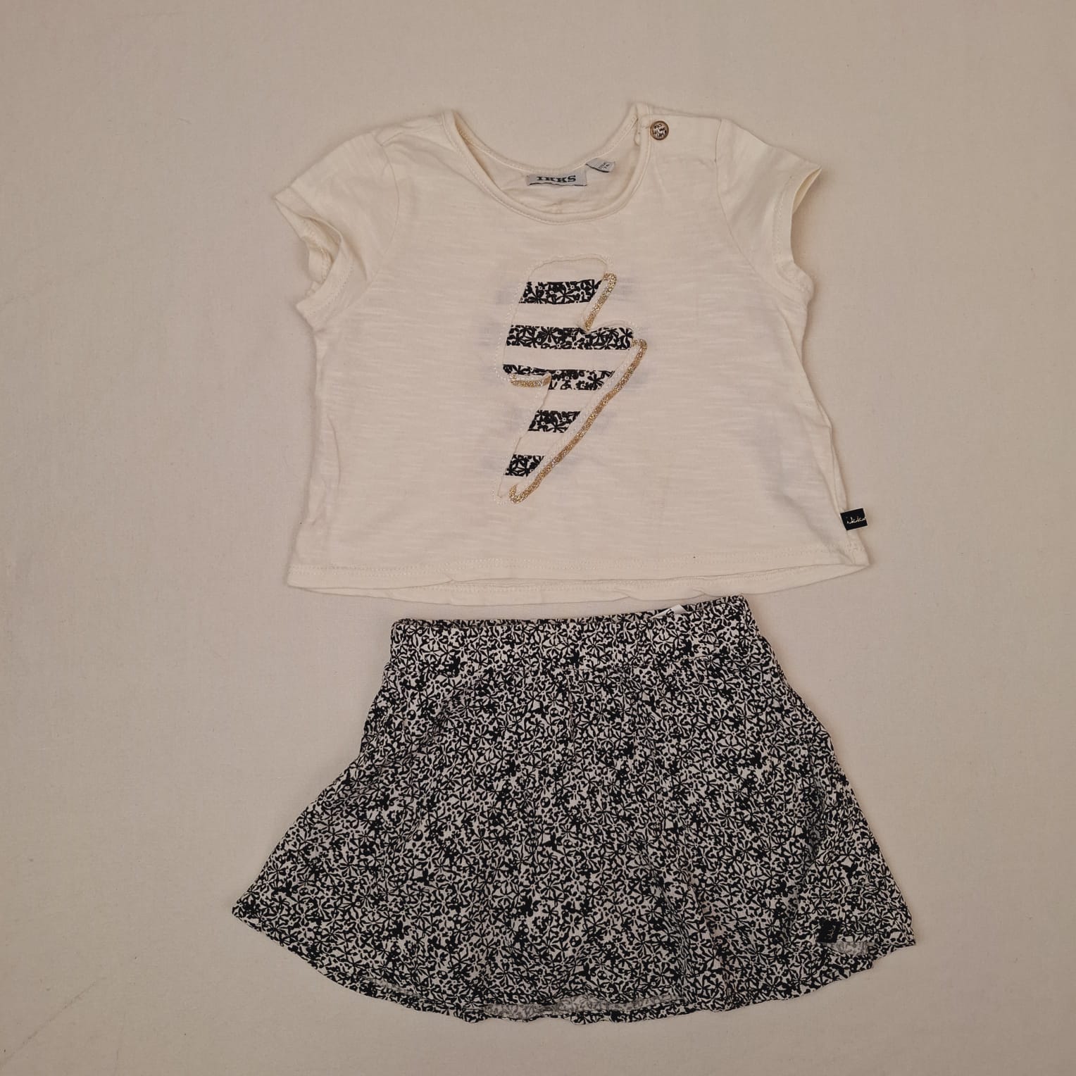 Autres commentaires : Ensemble 2 pièces: -T-shirt blanc à manches courtes, motif foudre, col rond, fermeture par bouton sur l’épaule gauche, 100% coton. – Jupe-short, motif floral rock blanche et noir, 100% viscose.