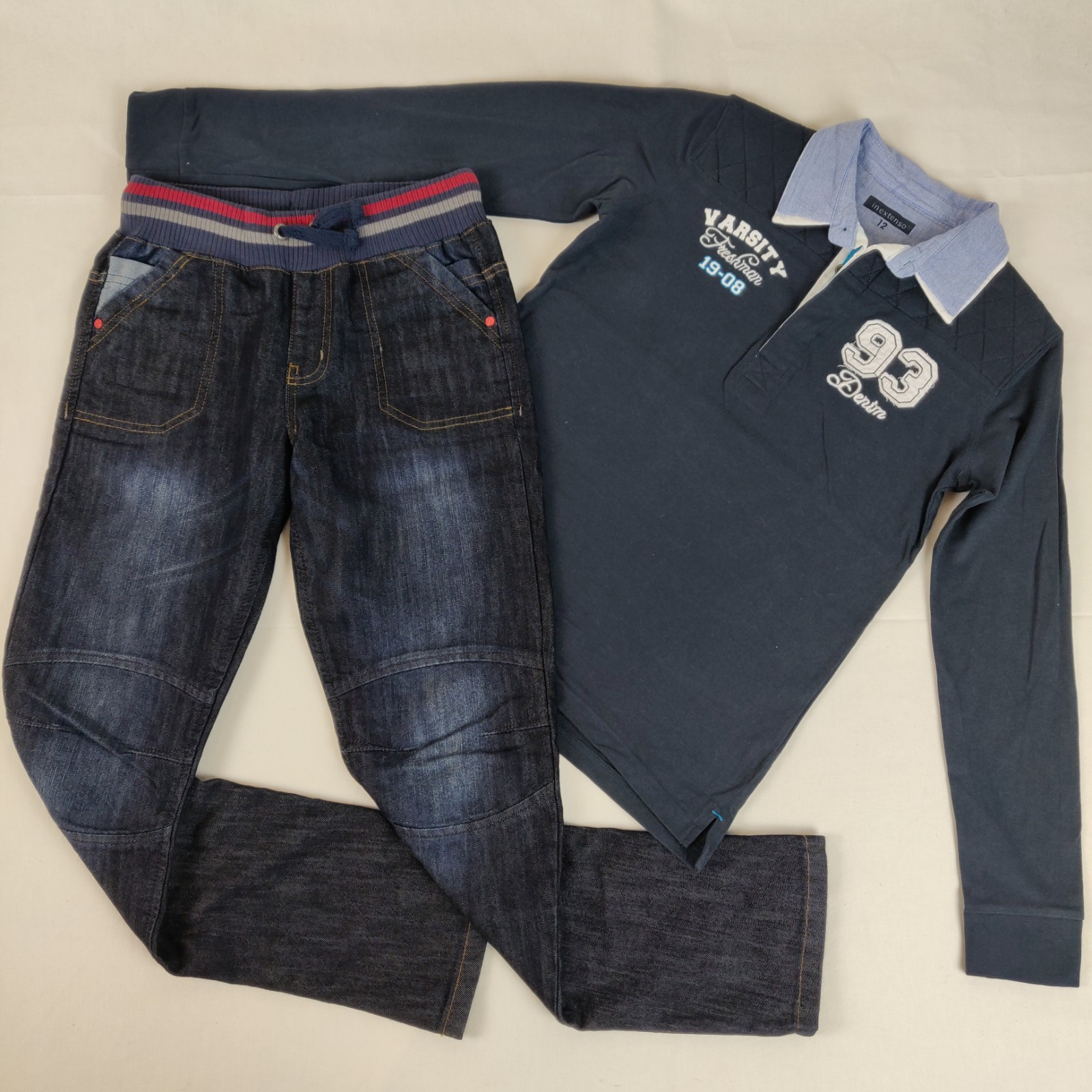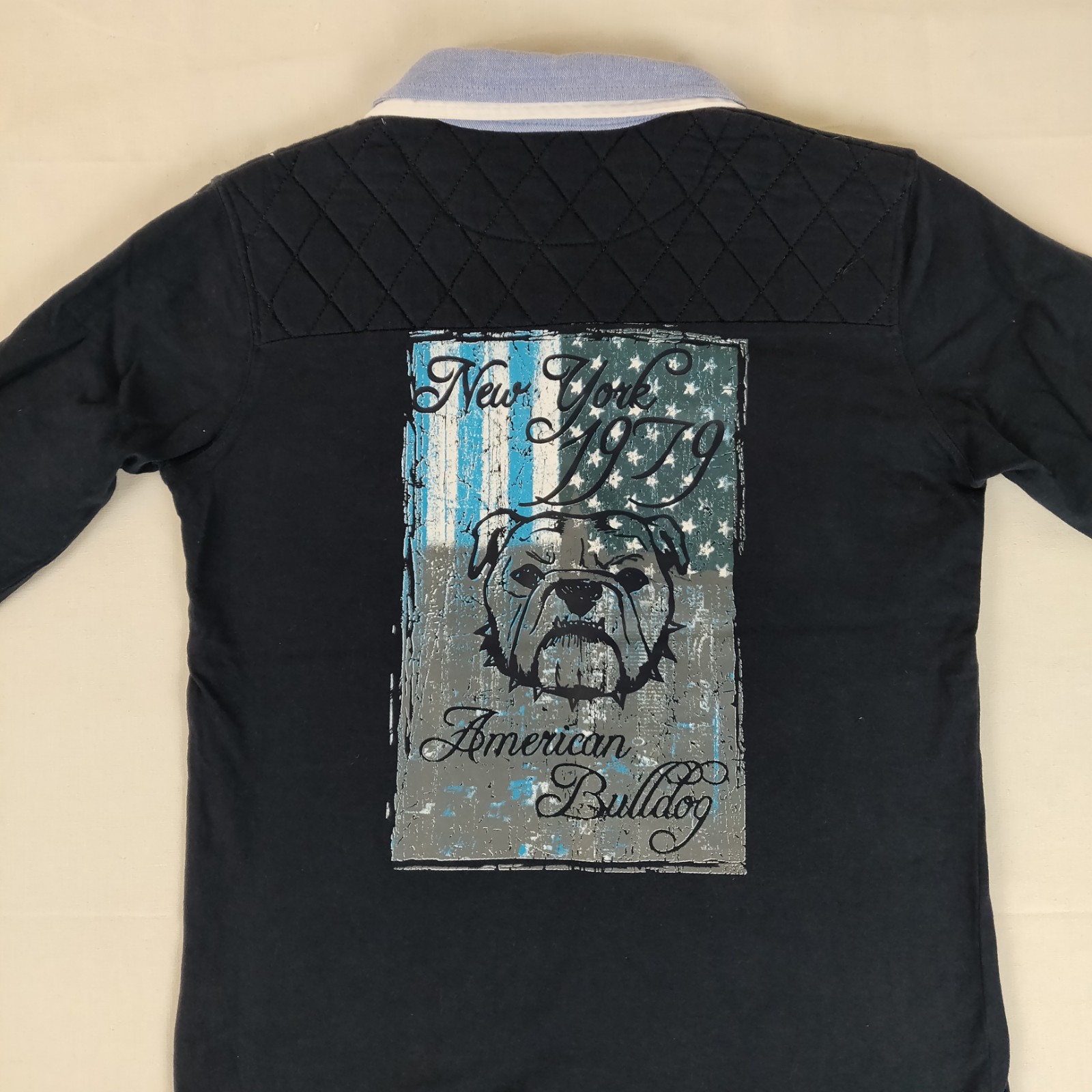 Autres commentaires : Polo à manches longues – bleu marine avec inscription centrale piquée « Yarsity 19-08 93 denim ». Ouverture centrale classique à 3 boutons. Double col bleu et blanc. La partie supérieure du polo présente un effet matelassé. L’ouverture possède des tâches de décoloration invisibles quand les boutons sont fermés. Motif central au dos bulldog accompagné de l’inscription « New Yorf 1979 American Bulldog ». Jean en demim bleu foncé. Taille façon tricot élastique bleu avec rayures rouge et grise. 2 poches latérales et 2 poches arrières. Marques d’usure au niveau des jambes.