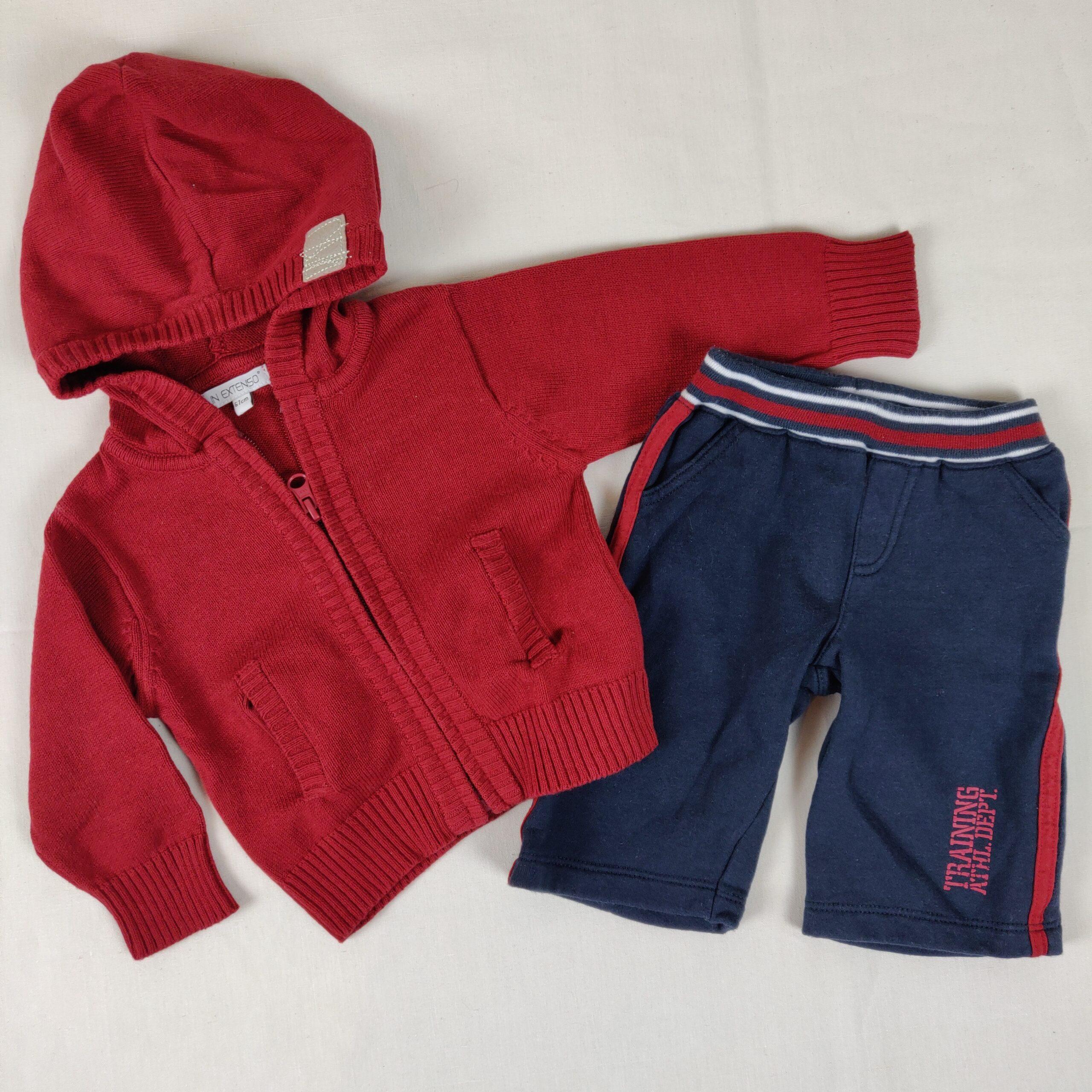 Autres commentaires : Ensemble de 2 pièces avec un pantalon sportswear bleu marine avec taille élastiquée avec bandes rouges sur le côté, inscription TRAINING ATHL. DEPT, assorti à un gilet en maille rouge à capuche zippé avec poches ventrales.