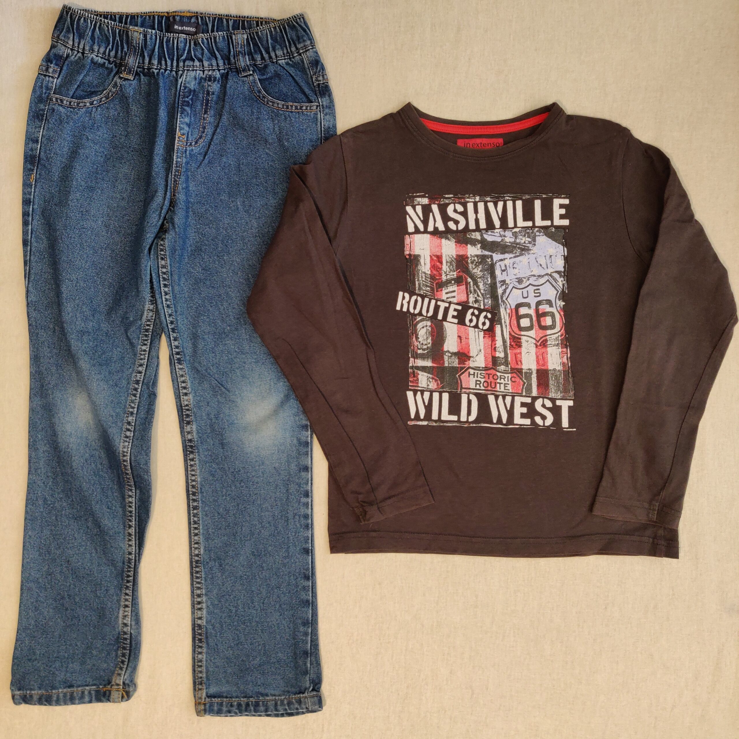 Autres commentaires : Jeans à taille élastiquée, légère usure des genoux, deux poches à l’arrière et deux devant. T-shirt manches longues marron, inscriptions « Nashville – Route 66 – Wild West » sur fond de drapeau américain dévalé (traces de rouge et de bleu clair).
