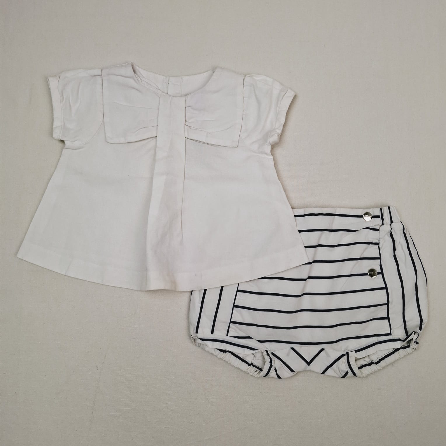 Autres commentaires : 41% lin. Ensemble 2 pièces Jacadi : Chemise blanche manches courtes, col claudine, ouverture au dos par boutons. 100% coton. Une cullotte doublée à rayures bleu marine et blanches, taille élastiquée avec 4 boutons décoratifs devant.