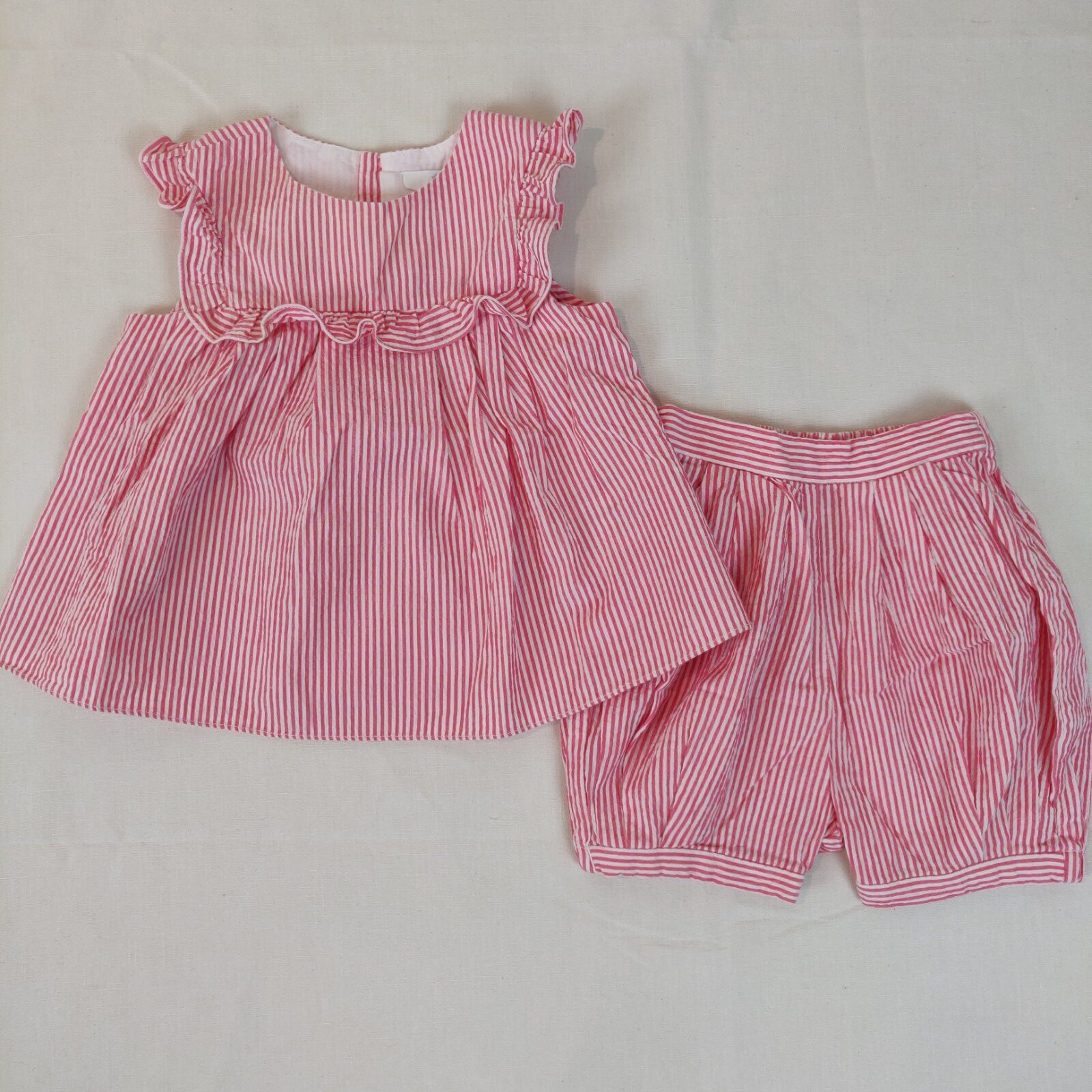 Autres commentaires : Tunique sans manche avec effet plastron – rayures horizontales rouges et blanches. Ouverture tout le long du dos à boutons classiques. Bloomer assorti – taille et ouvertures jambes élastiques.