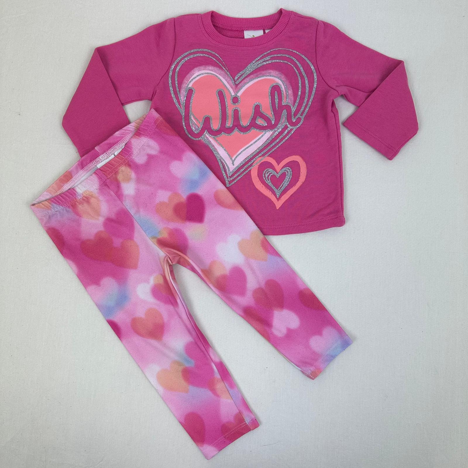 Autres commentaires : 10% spandex. Sweat rose sans capuche avec motif un coeur argenté. Legging rose avec taille élastiquée.