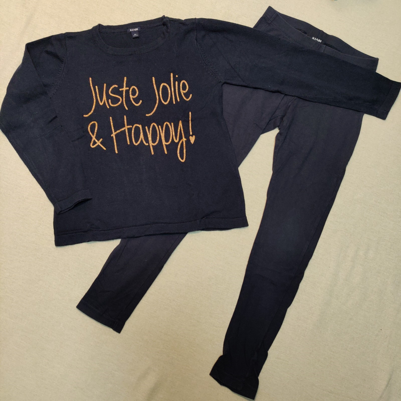 Autres commentaires : Pull bleu marine col rond, inscription « Juste jolie & happy ». Legging bleu marine uni, taille élastiquée. En parfait état.