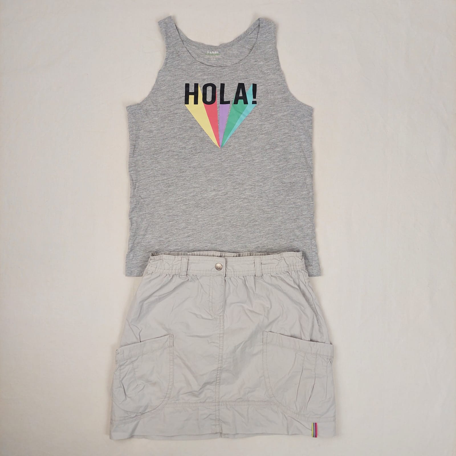 Autres commentaires : Débardeur KIABI en coton biologique, inscription HOLA ! et jupe droite courte beige, NKY, avec poches plaquées devant, ceinture élacstiquée.