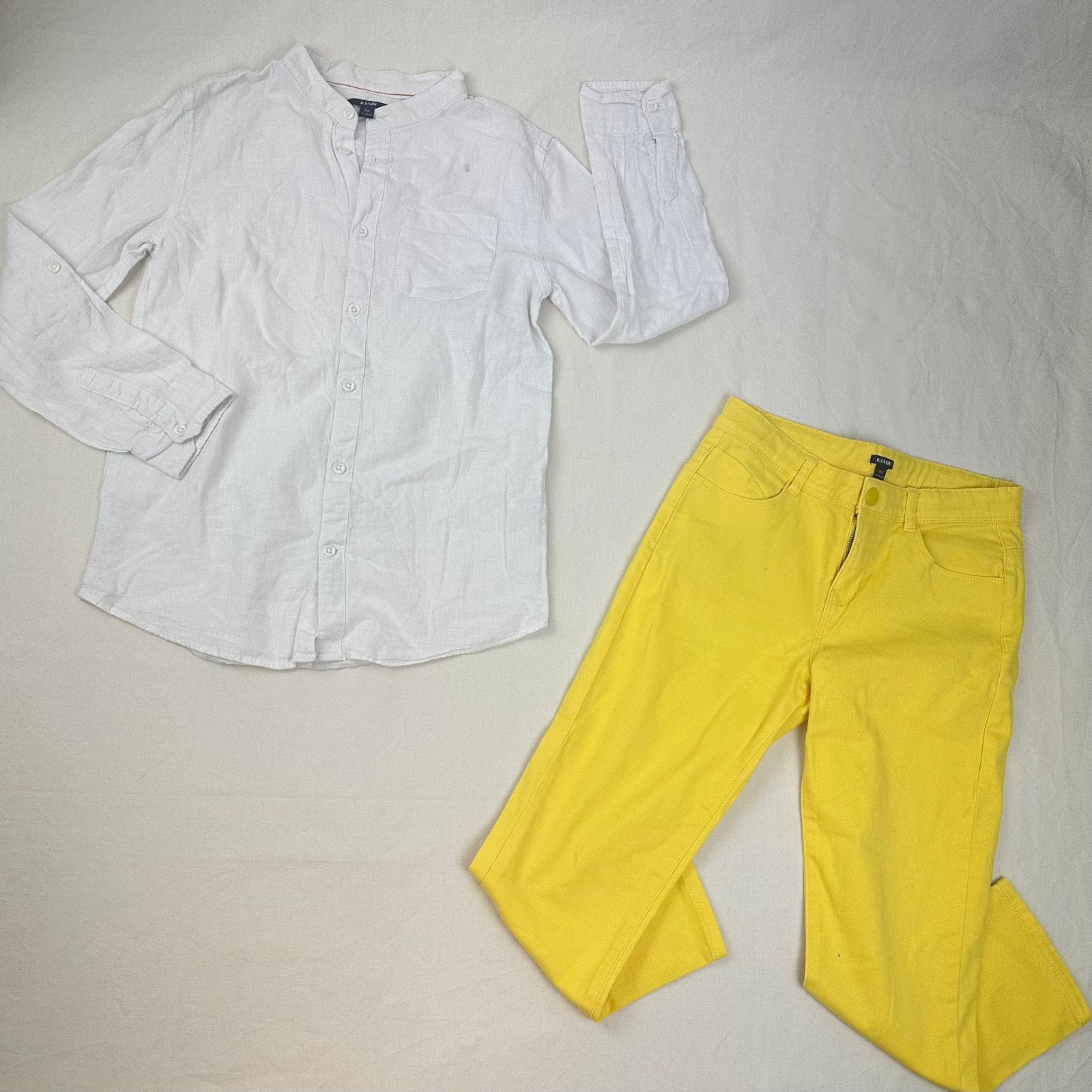 Autres commentaires : 45% coton. Chemise lanches manches longues avec une fermeture devant par boutons. Pantalon jaune avec taille élastiquée et ceinturée. Petit défaut: petite tâche noir sur la devanture à gauche de la chemise.