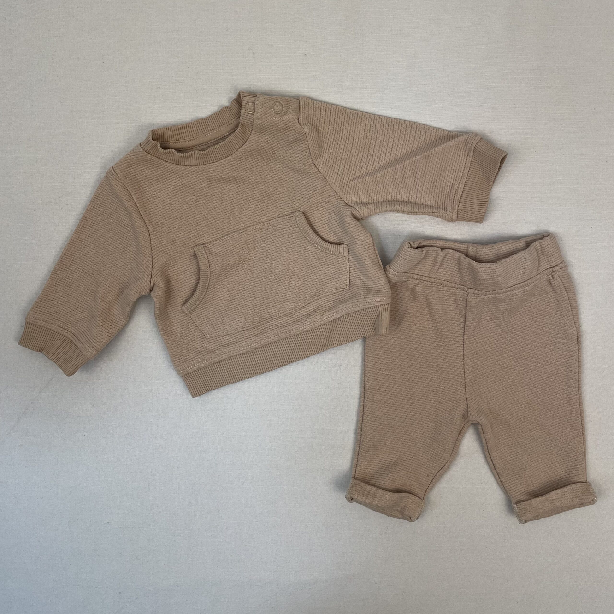 - Sweat beige sable côtelé, double poche ventrale, fermeture à l’épaule gauche par boutons pression.