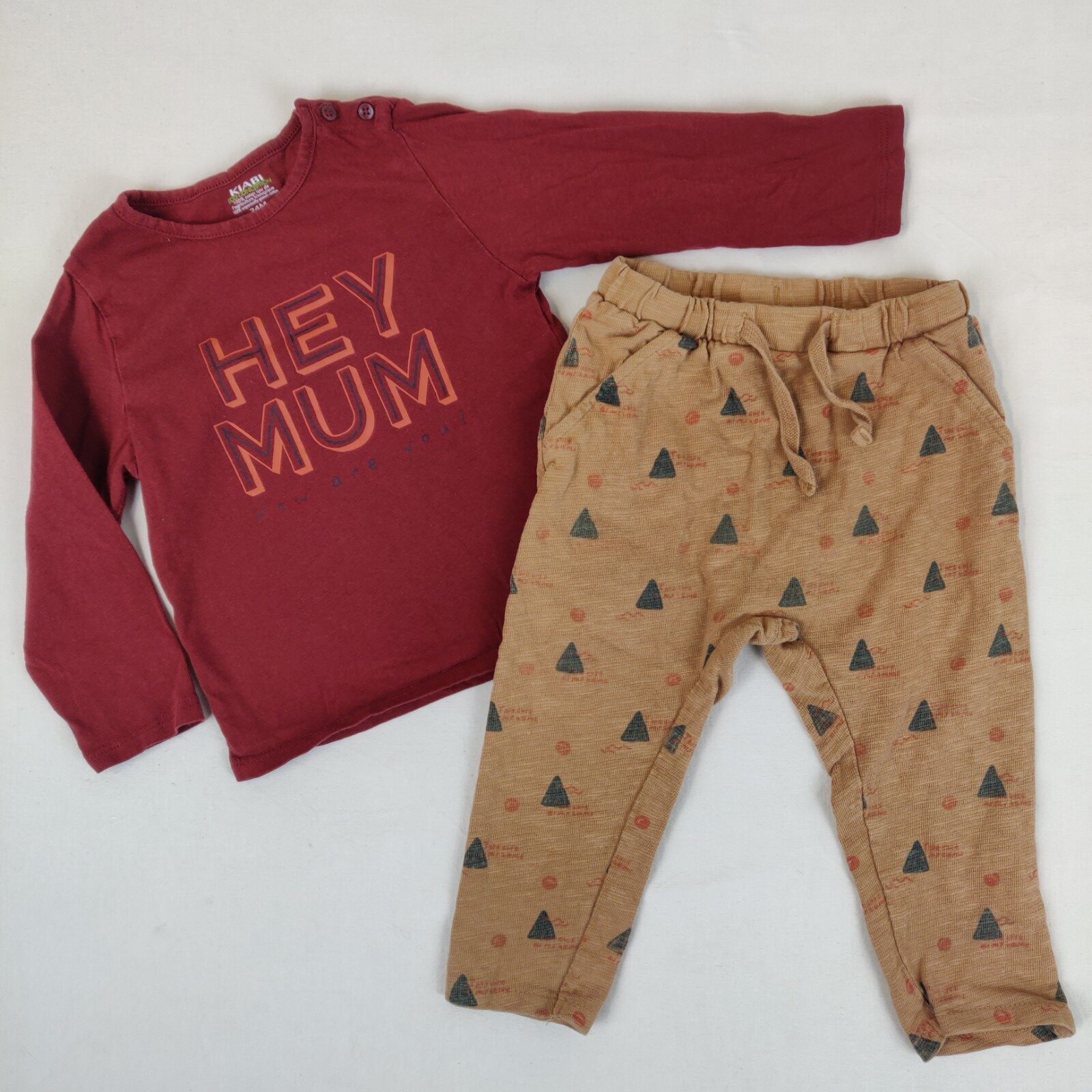 Autres commentaires : T-shirt manches longues rouge bordeaux soussigné « Hey Mum »avec 2 boutons à l’epaule. Jogging marrons avec des petits dessins de sapins verts.