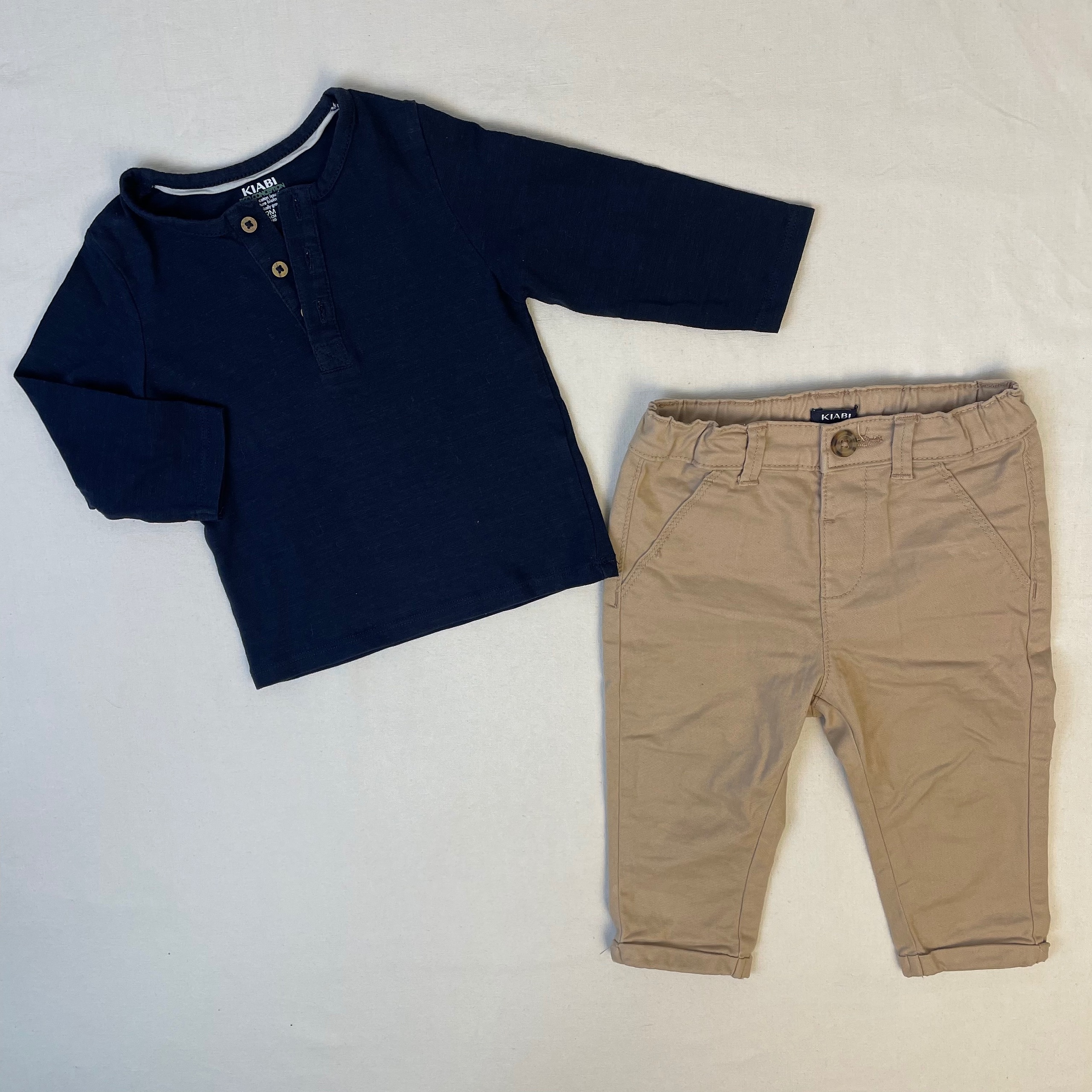 - Ensemble 2pcs Kiabi, un polo à manches longue avec un col tunisien et un pantalon beige avec élastique a la taille.