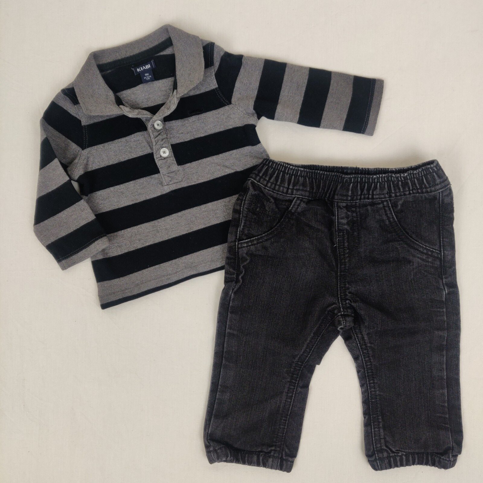 Autres commentaires : Polo manches longues à rayures gris et noir et contient 87% coton et 13% viscose. Jean Noir taille élastiquée et contient 74% coton et 26% polyester.