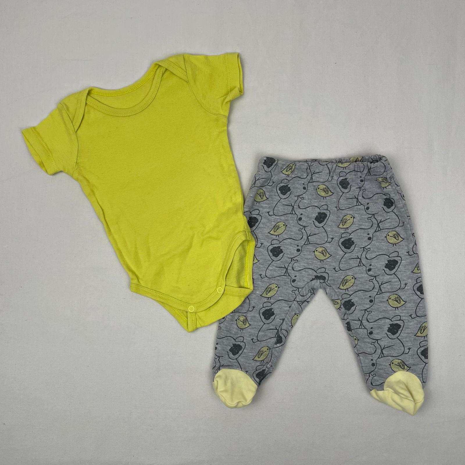 Autres commentaires : Ensemble 2 pièces : – Body uni jaune vert fluo à manches courtes Kiabi. – Pantalon sportswear gris sans marque avec pieds jaune clair au-dessus, parsemé d’éléphanteaux noirs et gris et de poussins jaunes, taille élastiquée. Un peu