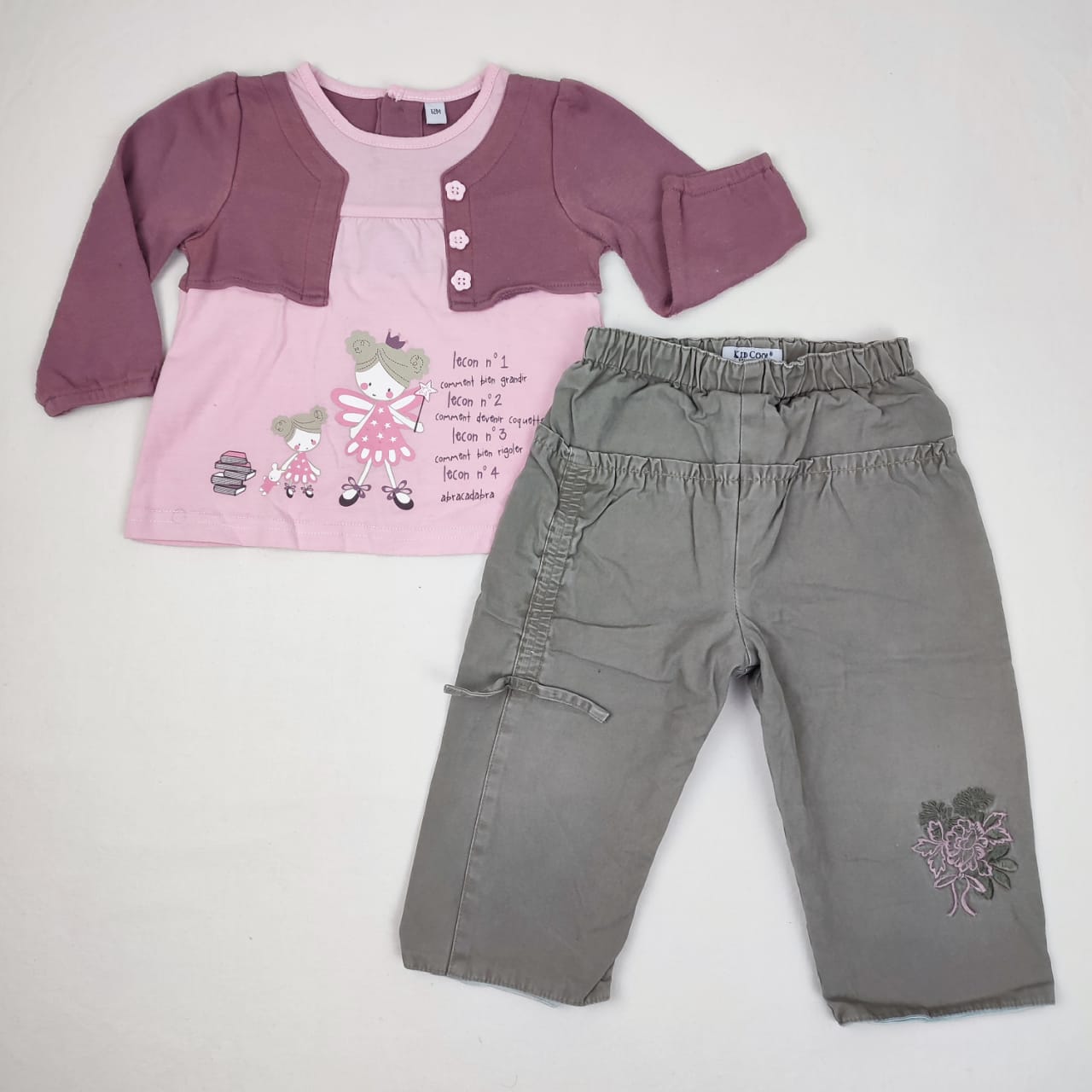 Autres commentaires : T-shirt sans marque manches longues avec effet superposition de boléro, 40% Polyester. Pantalon en coton, doublue en jersey de coton. Motif petite fleur brodée au bas de la jambe gauche. Taille élastiquée.