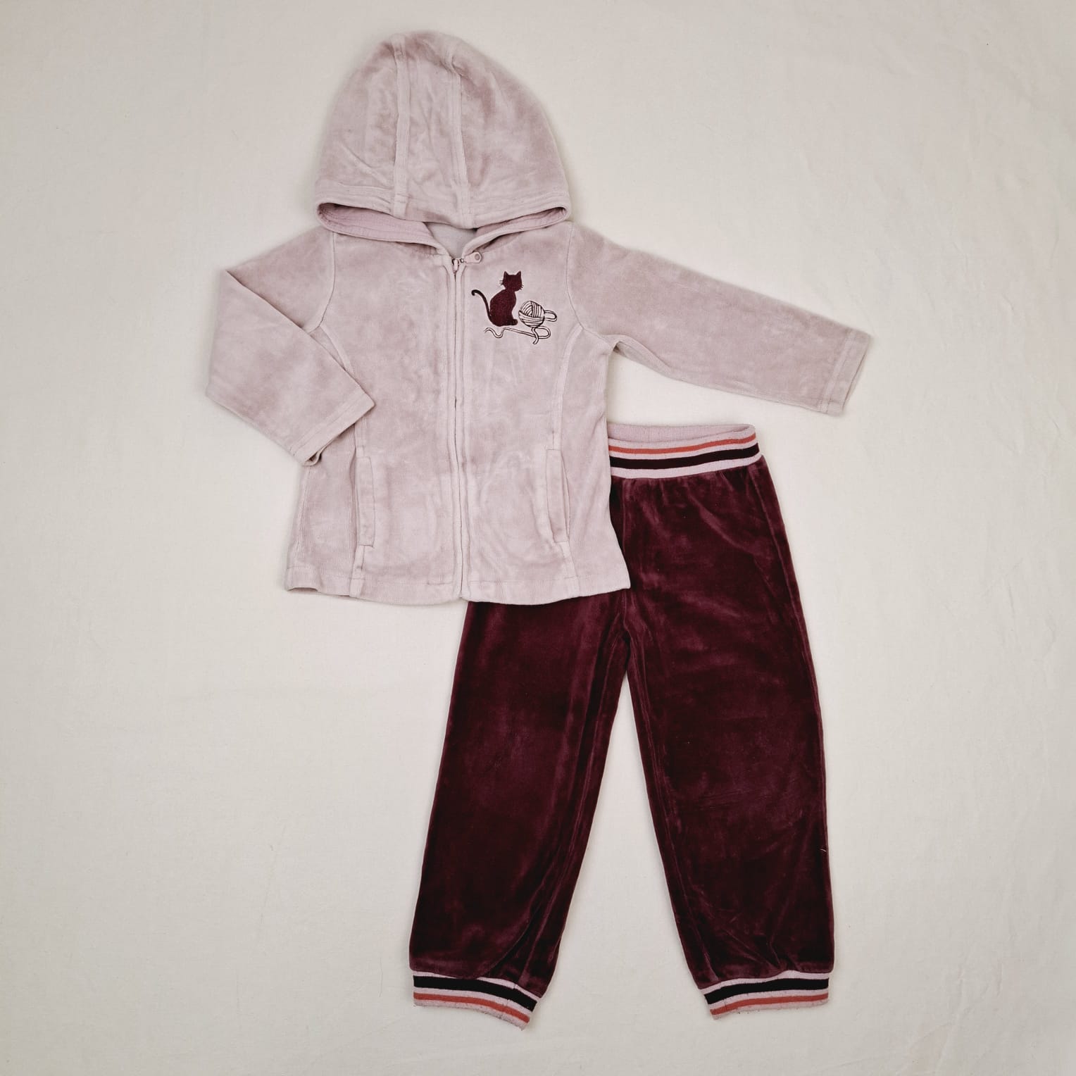 Autres commentaires : 20% polyester. Ensemble 2 pièces Kimbaloo violet à motif chat: un pantalon de jogging taille et pieds élastiquée avec rayures, un à capuche et poches sweat assorti avec une fermeture par zip devant.