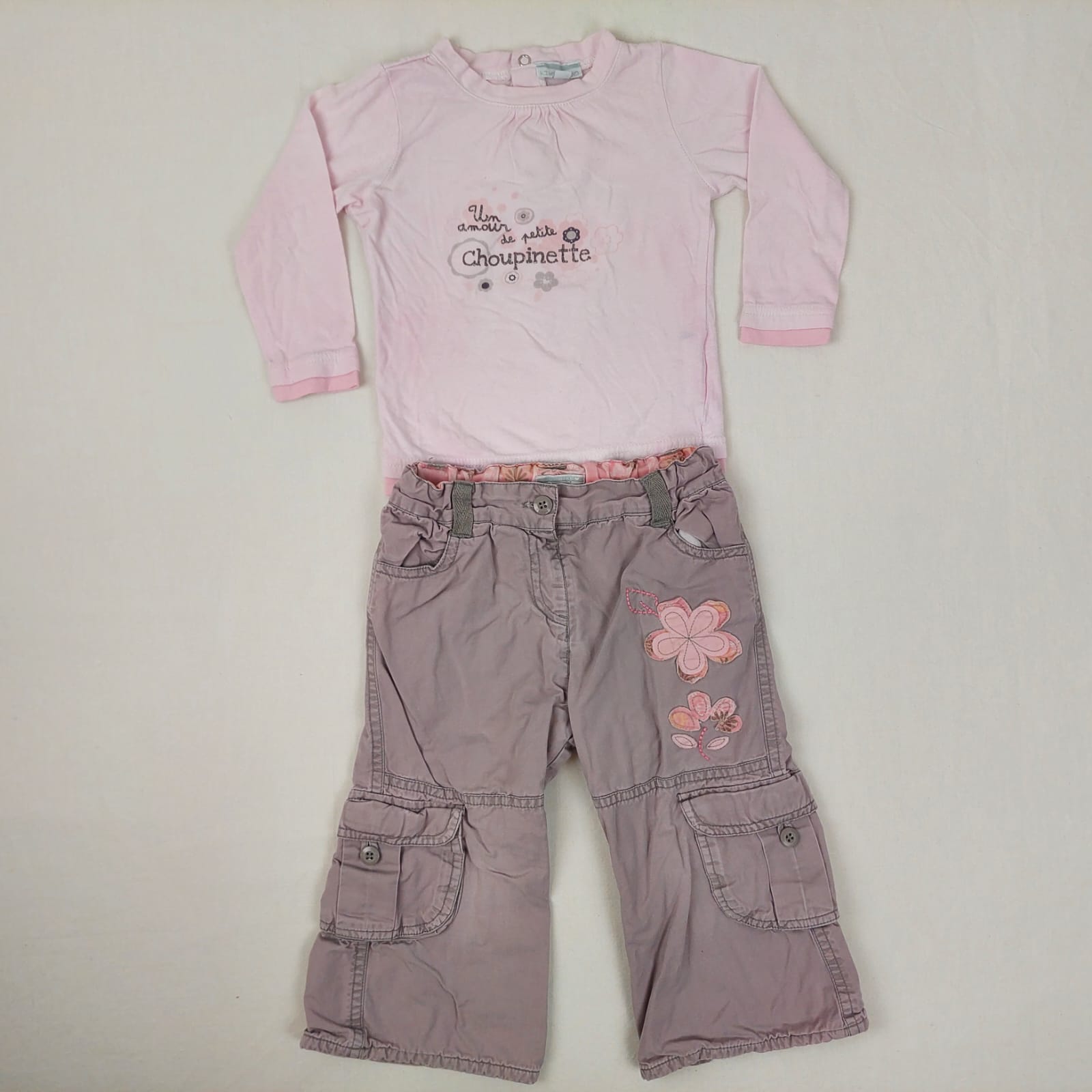 Autres commentaires : T-shirt manches longues rose imprimé « Un amour de petite Choupinette », pantalon cargo gris rosé , patch fleur sur la jambe gauche