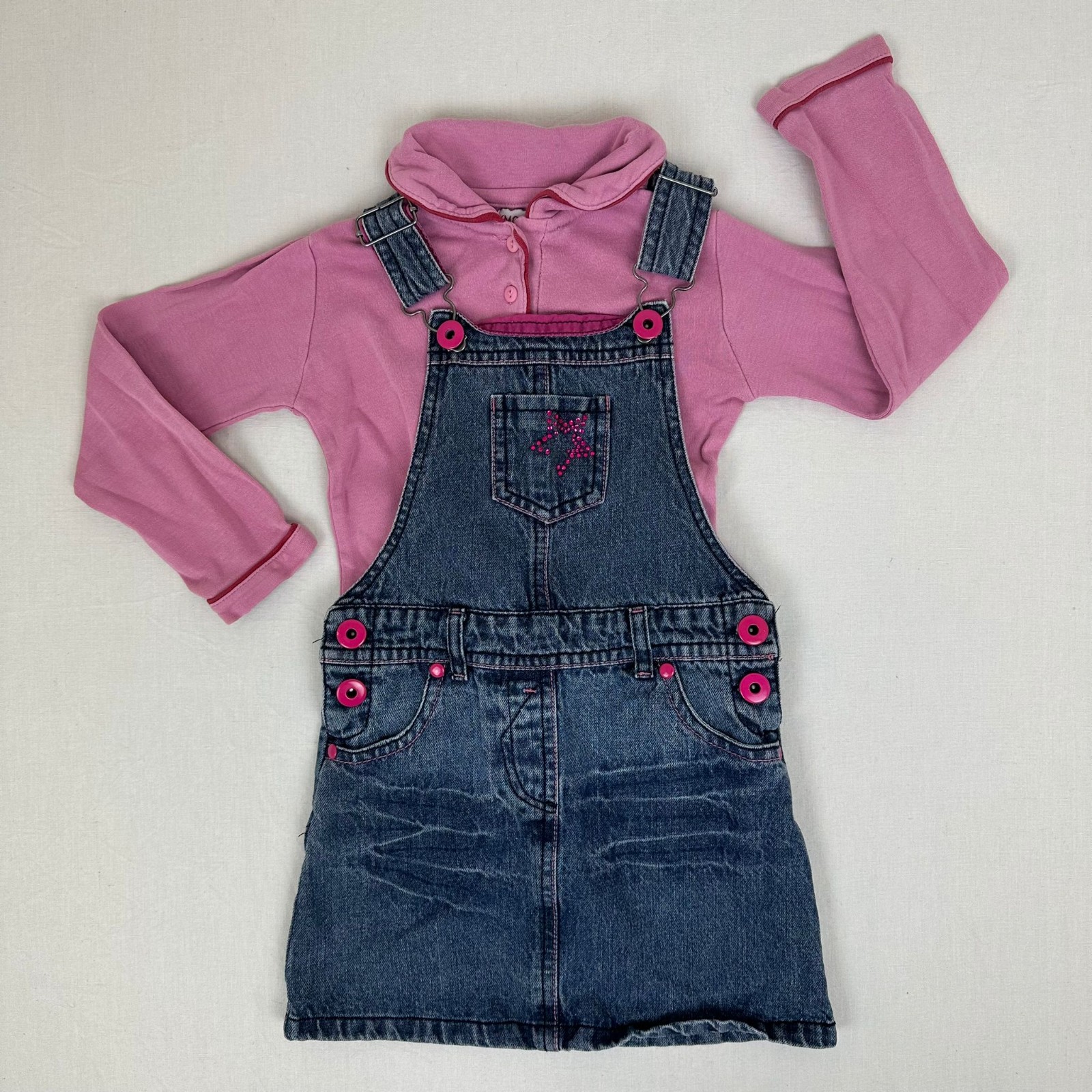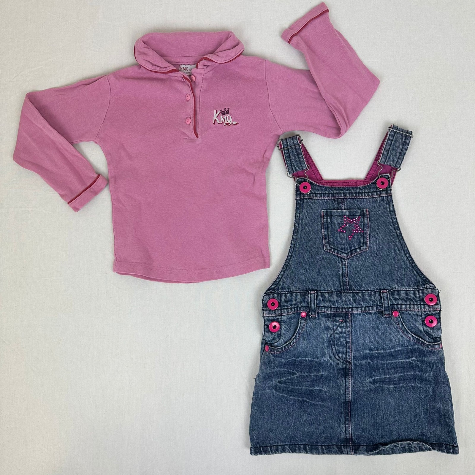 Autres commentaires : Polo manches longues rose avec une fermeture au col par boutons. Salopette robe en jean avec manches en bretelles ajustable et une fermeture par boutons sur les cotes lateraux.