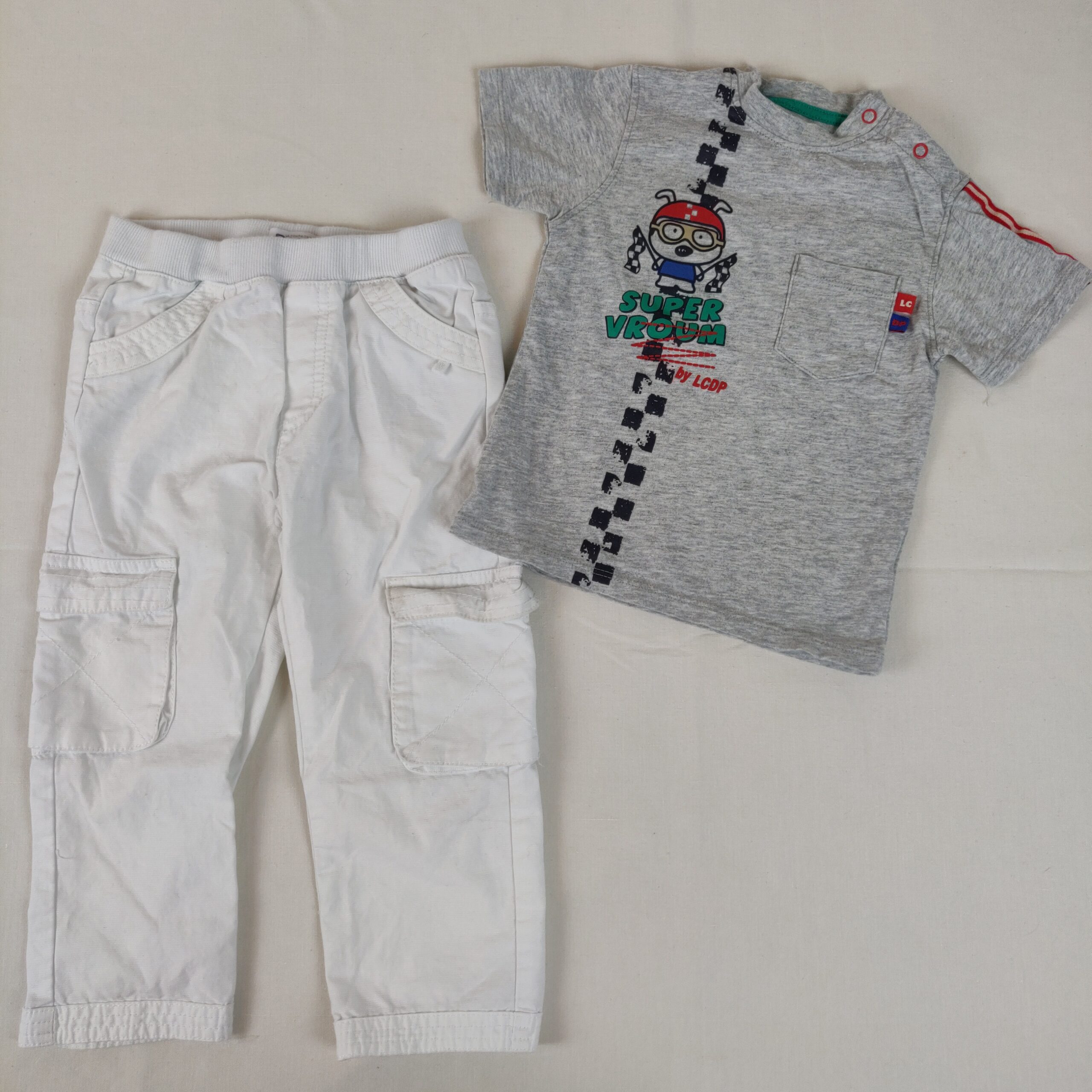 Autres commentaires : T-shirt manches courtes – gris chiné avec motifs centraux pilote de course noirs et multicolores, ouverture latérale à partir du col à 2 boutons pression, bande de tissu rayé rouge et beige sur la manche, poche centrale. Pantalon – blanc – taille élastique façon tricot. 2 poches latérales, 2 poches à rabat au niveau des genoux et 2 poches arrières en trompe-l’oeil. Usure normale du vêtement.