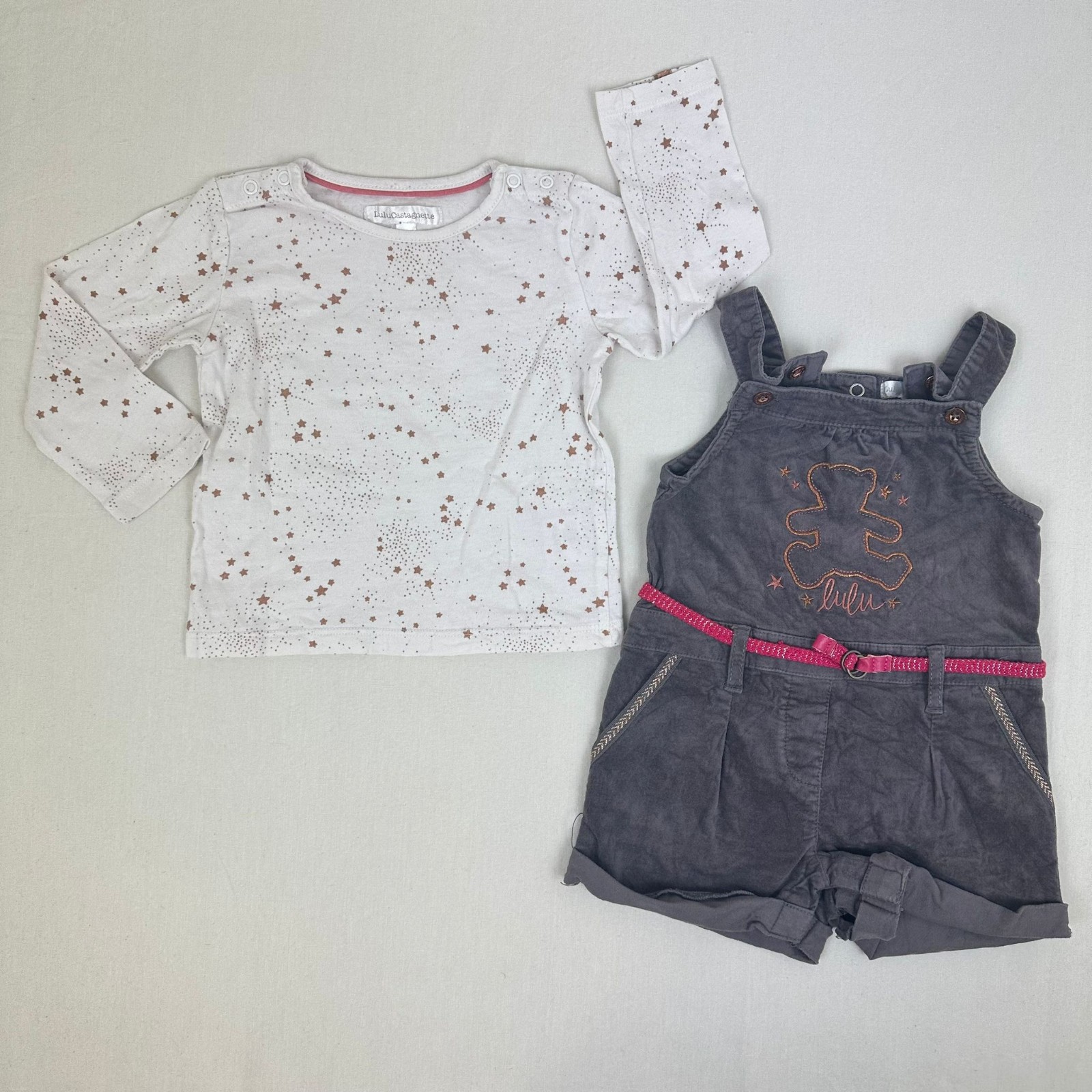 Autres commentaires : 2% elasthanne. Salopette courte avec manches ajustables par boutons, une ceinture à la taille et une fermeture au dos par boutons pressions. T-shirt manches longues blanc etoilé en doré.