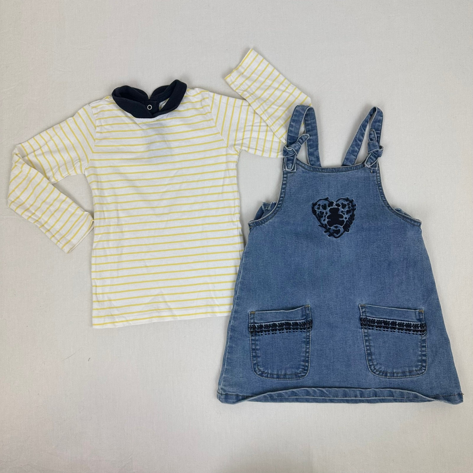 Autres commentaires : Salopette robe en jean avec manches en bretelle ajustable et 2 poches latérales. T-shirt manches longues blanc avec rayures jaunes, col claudine et une fermeture au dos par boutons pressions.