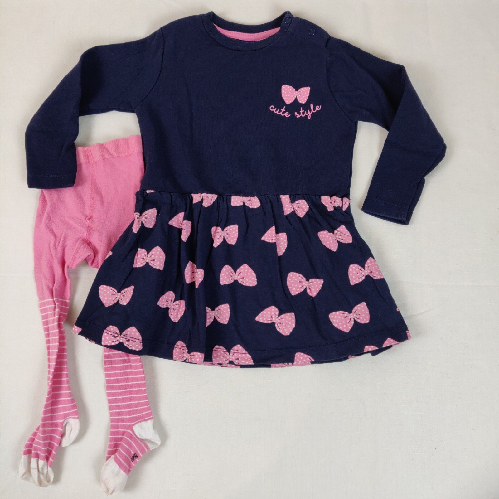 Autres commentaires : 20% coton. Ensemble 2 pièces. Une robe à manches longues – bleu marine avec un noeud rose central à pois blancs et inscription « Cute style ». Ouverture latérale à 2 pressions. Motifs noeuds roses à pois blancs sur la jupe. Collants (Coton majoritaire, 23% polyamide, 3%élasthanne) rose à fines rayures blanches. Léger effet pelucheux et discrètes tâches au niveau de la pointe des pieds.
