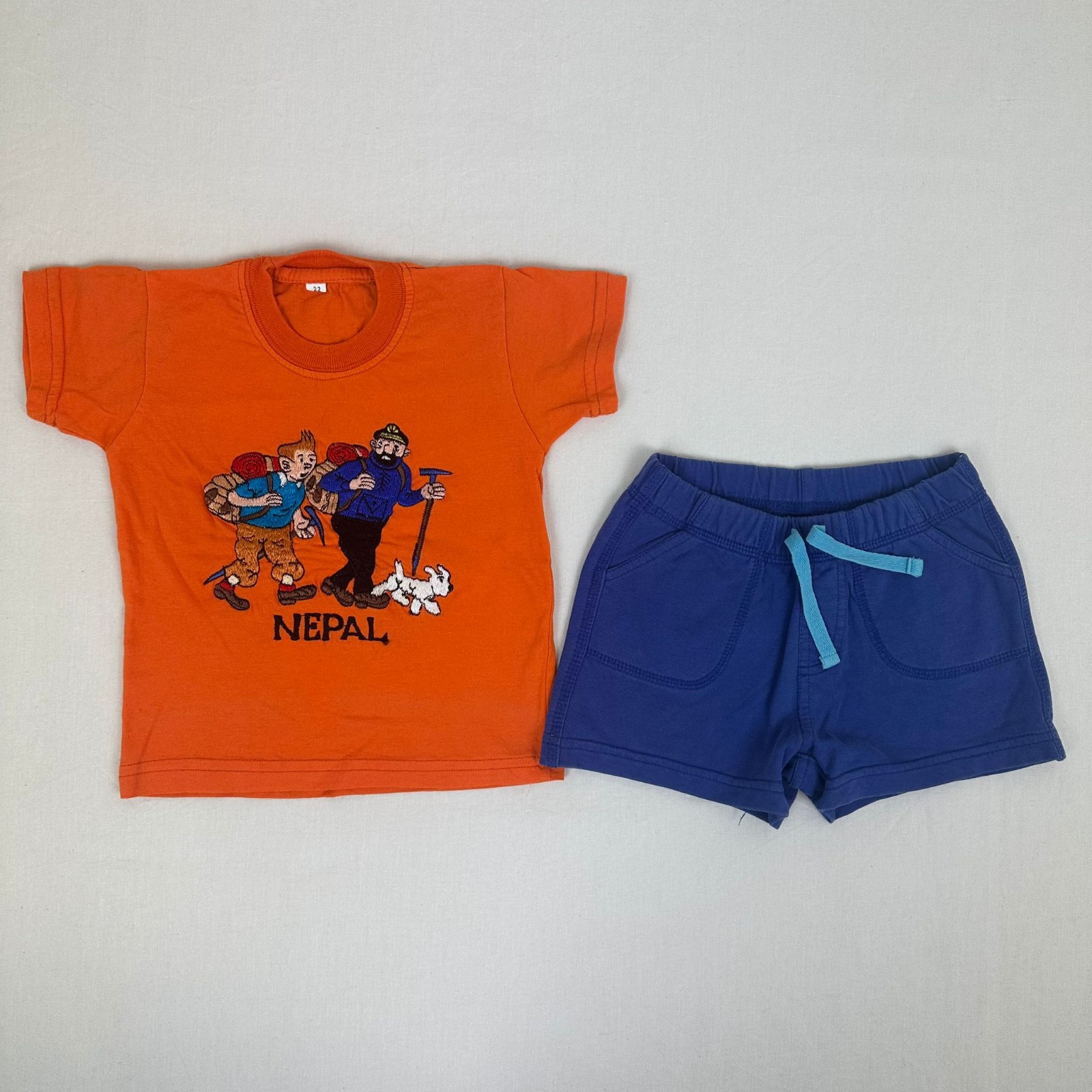 Autres commentaires : Short Lupilu bleu avec taille élastiquée. T-shirt manches courtes orange Sans marque avec motif Nepal.