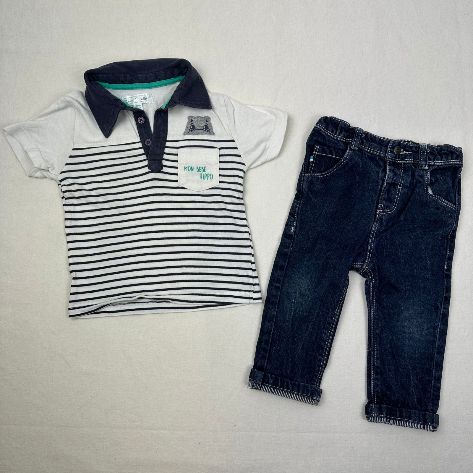 Autres commentaires : Polo manches courtes blanc avec des rayures bleu foncé et une fermeture devant par boutons. Jean bleu foncé avec taille élastiquée et ceinturée.