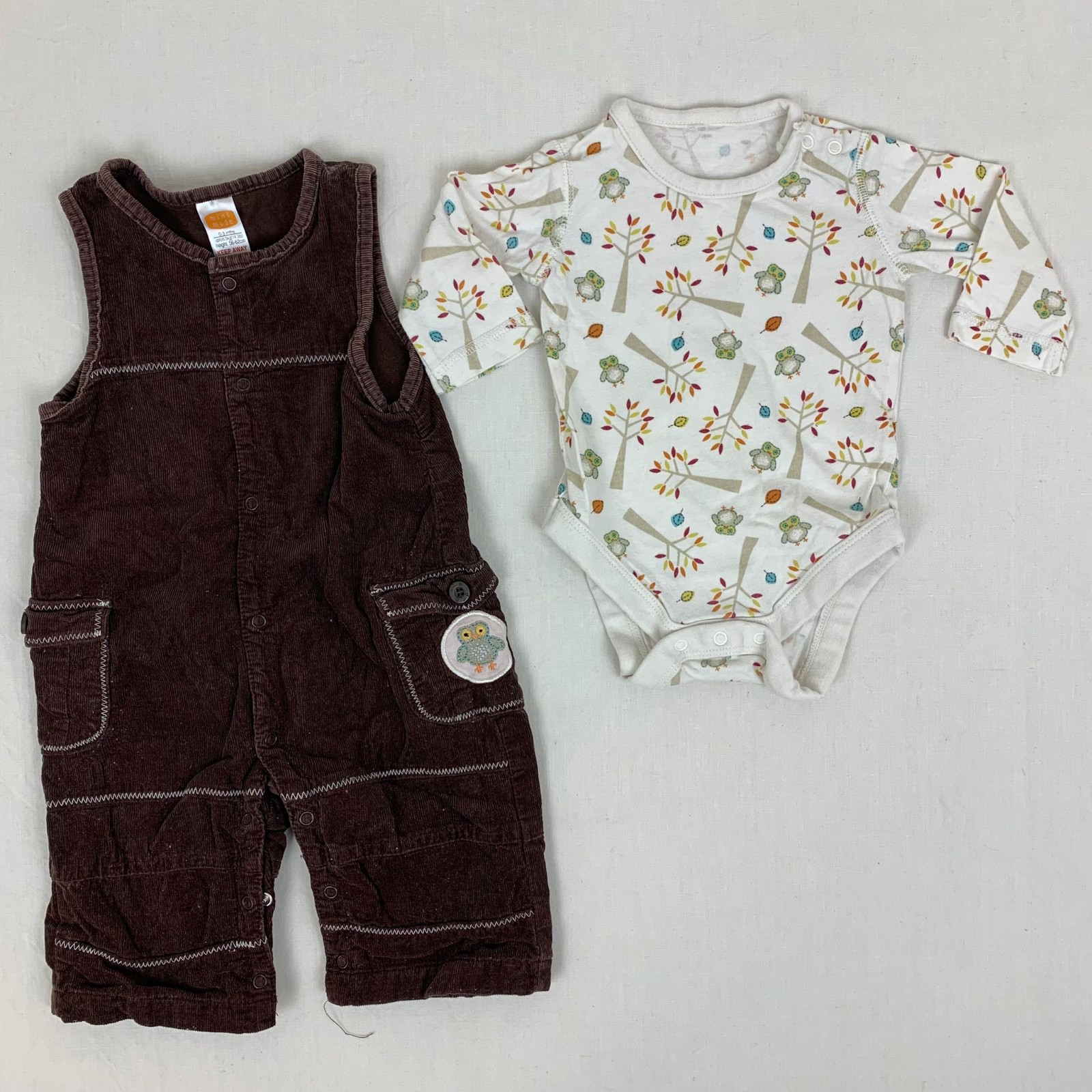 Autres commentaires : Salopette marron en jean sans manches. Body blanc avec des motifs d’arbre orange et vert manches longues.