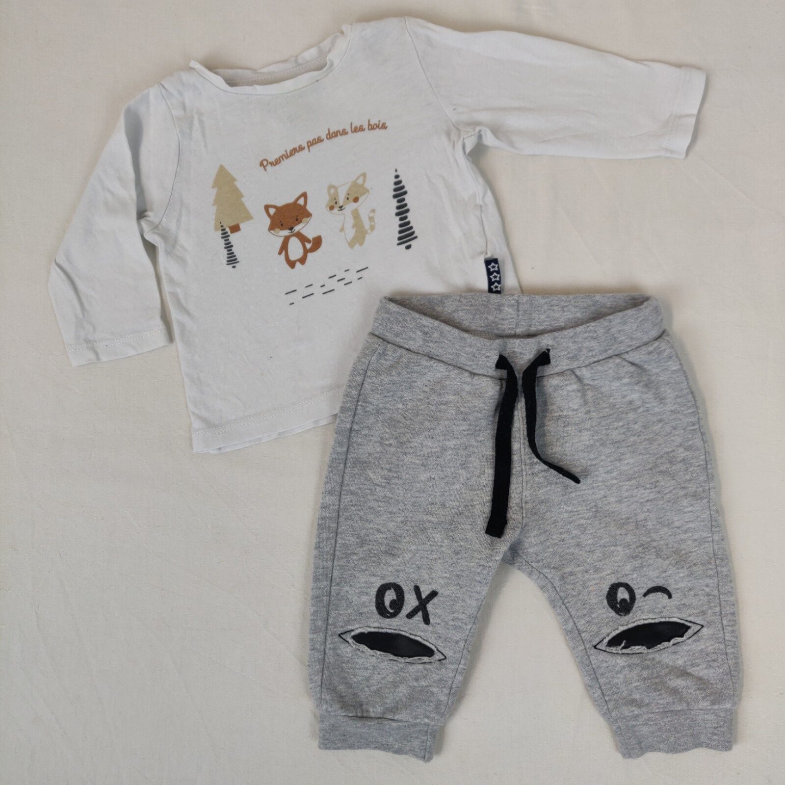 Autres commentaires : Pantalon de jogging Minibanda gris, taille élastique. T-shirt manches longues Mes Petits Cailloux blanc à motifs renardeaux dans le foret, marron et noir, offert -petites tâches au bas.