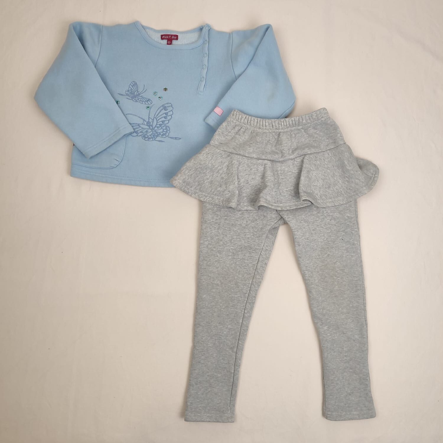 Autres commentaires : Ensemble 2 piéces : – Sweat épais bleu clair Miss P. Boy, fermeture par boutons pression sur le devant gauche, motif papillons avec mini fleurs en pierres scintillantes. – Pantalon sportswear gris clair avec volant, sans marque.