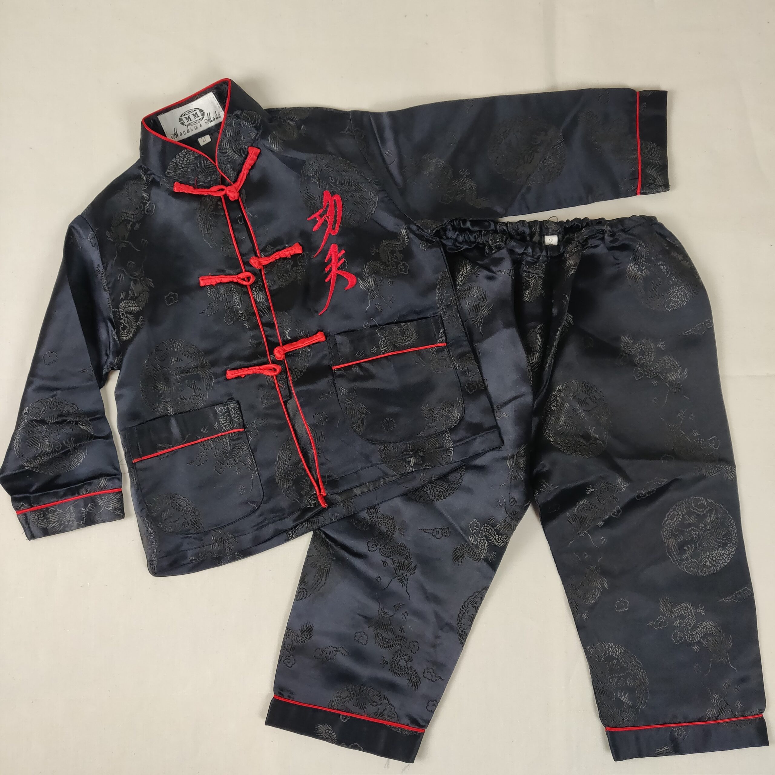 Autres commentaires : 30% polyester – Ensemble traditionnel chinois, pantalon/veste noir satiné avec idéogramme, attaches et bordures rouges.