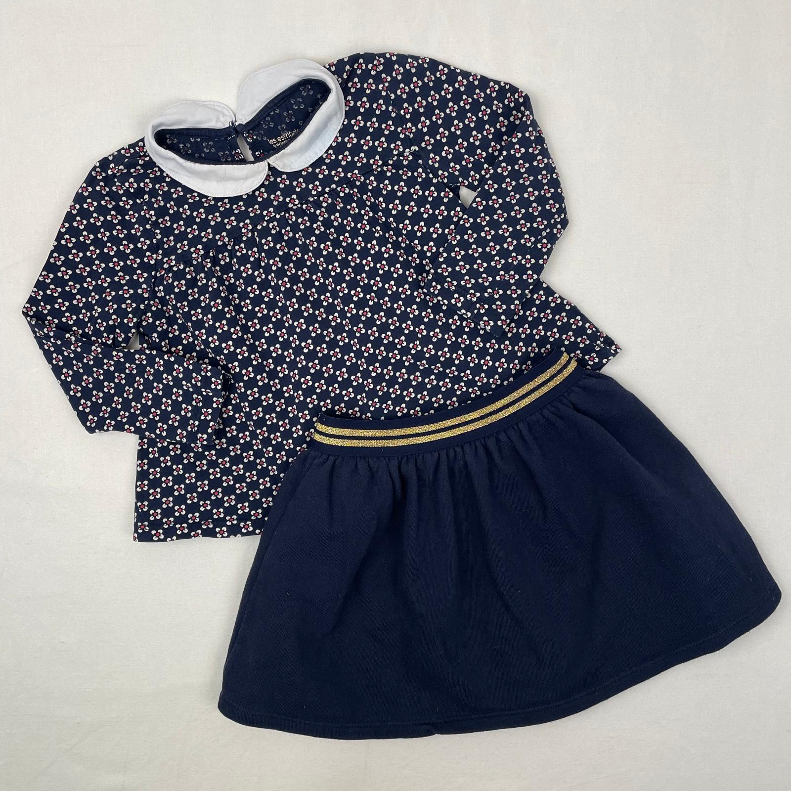 Autres commentaires : Ensemble 2 pièces : -1 T-shirt à manches longues, bleu marine à imprimé fleuri, col claudine blanc ; -1 jupe bleue marine élastiquée.