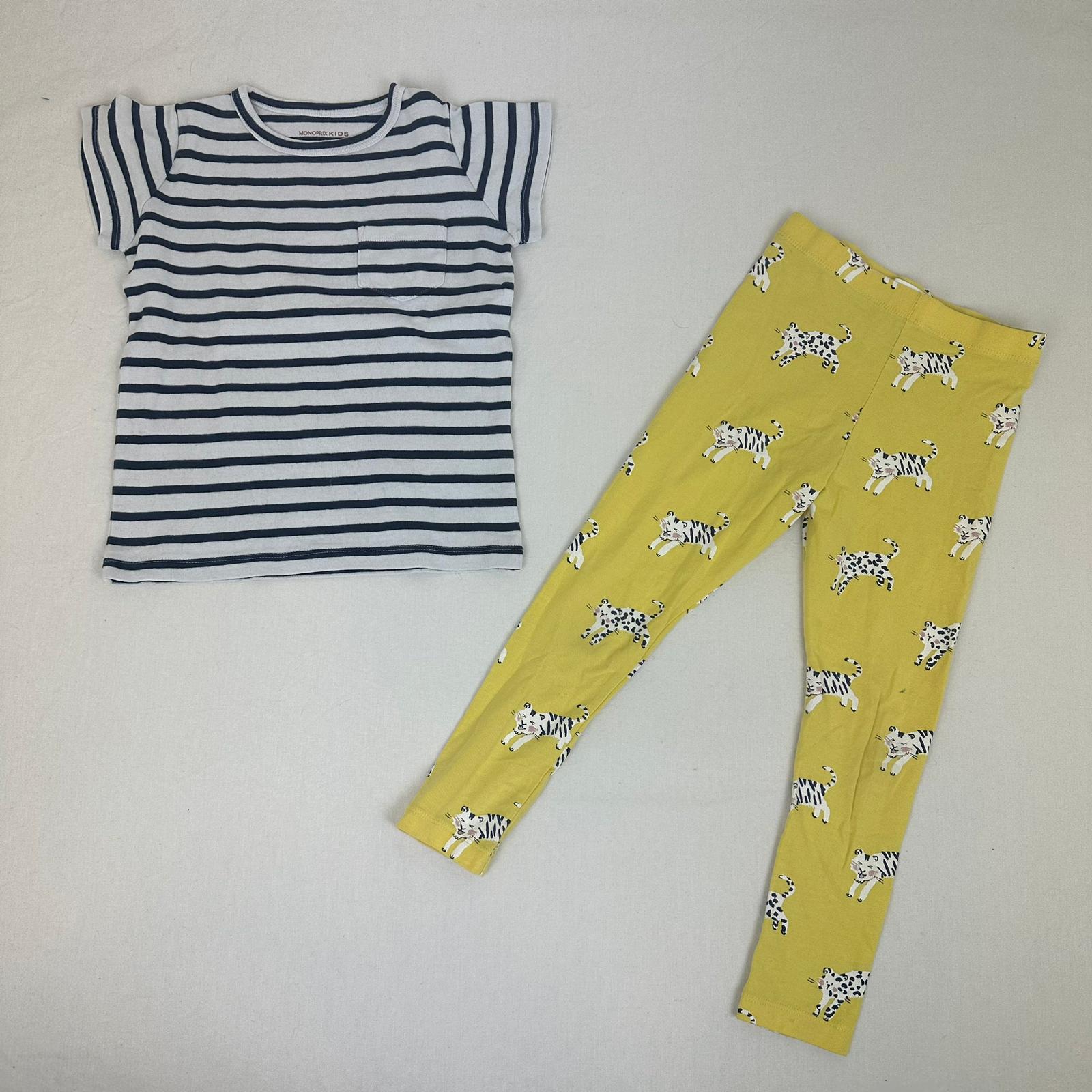 Autres commentaires : T-shirt Monoprix blanc manches courtes avec rayures bleu foncé. Legging jaune avec motif chat.