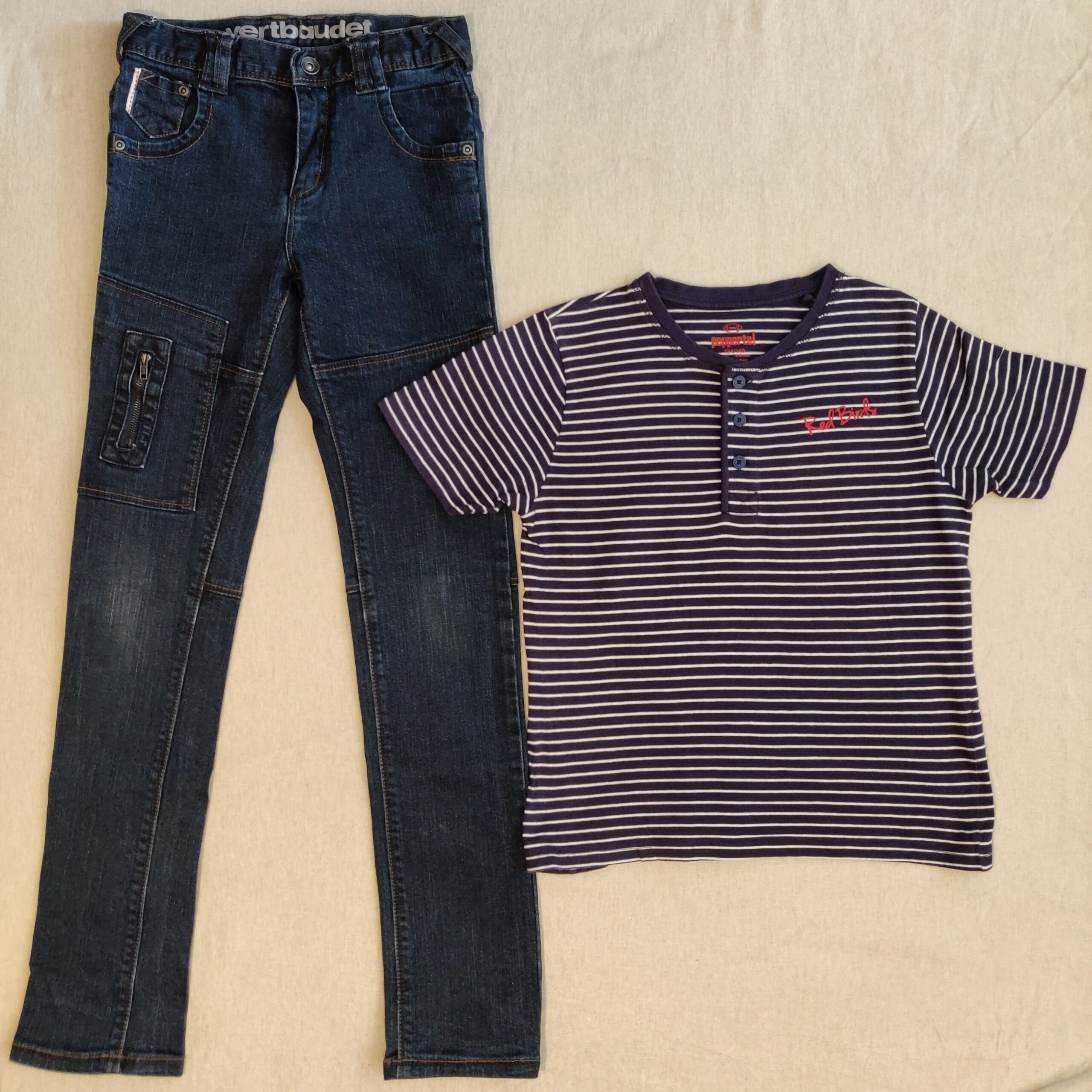 Autres commentaires : Jeans Verbaudet denim épais, taille droite, ajustable. Probablement jamais porté. T-shirt marinière manches longues Pepperts! fermé avec 3 boutons, en parfait état.