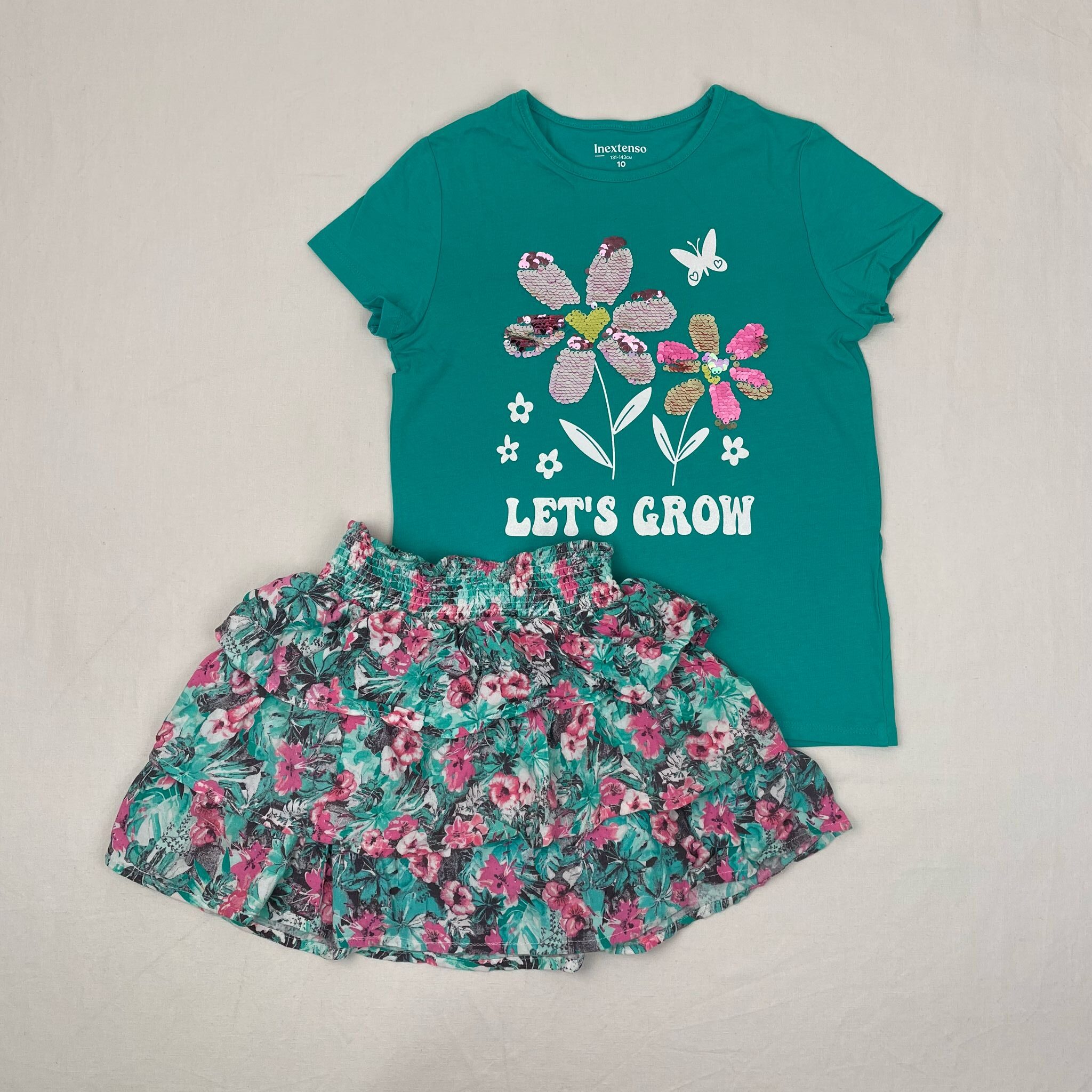 Autres commentaires : Ensemble 2 pièces : – T-shirt vert printanier, devant motifs fleurs en sequins roses, jaunes et dorées et papillon blanc avec incription blanc scintillant « Let’s grow ». – Jupe à volants superposés Page One Young, imprimé floral vert printanier et rose, large taille élastiquée, viscose 100%.