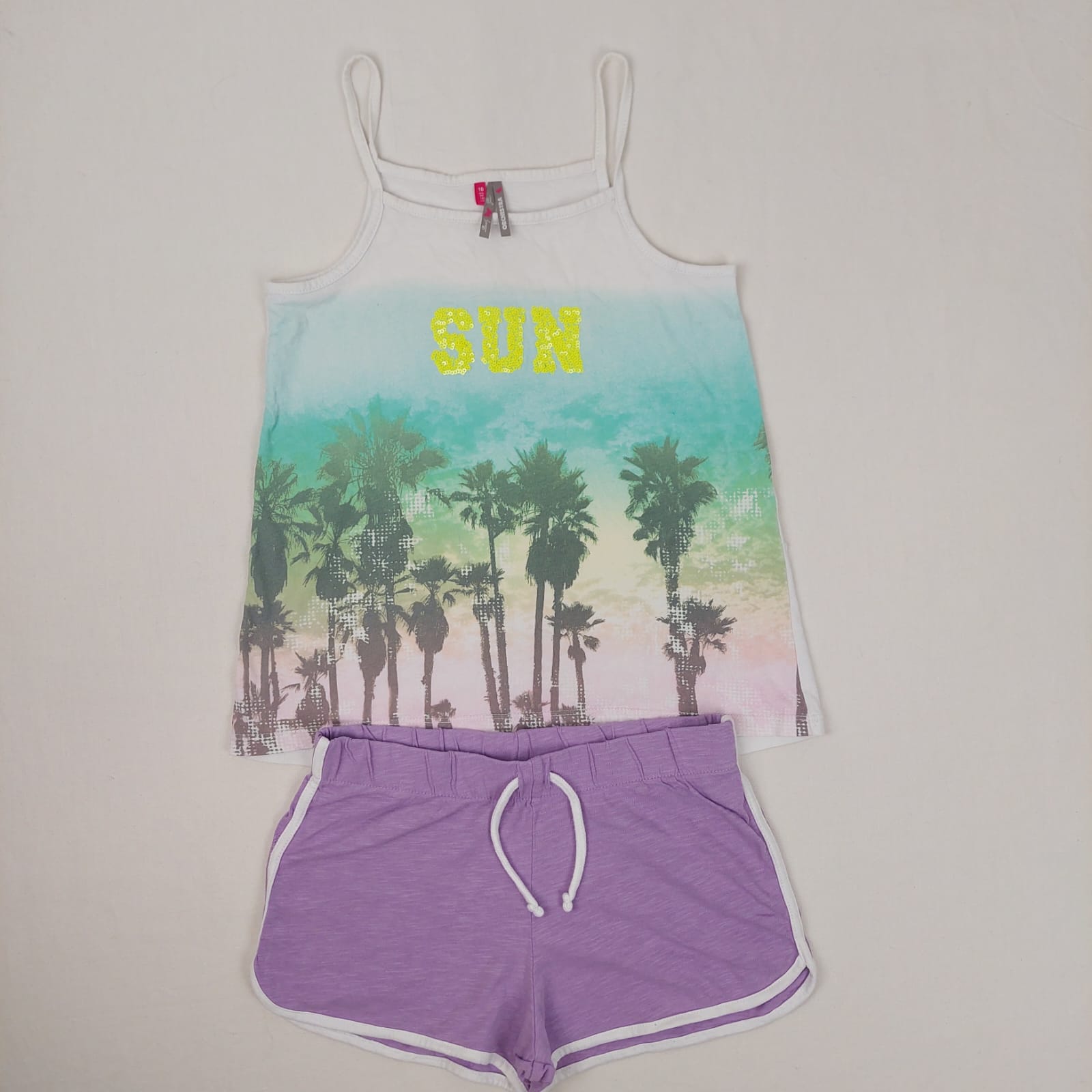 Autres commentaires : Débardeur Orchestra à bretelles imprimé tropique, « SUN » en sequin, short violet taille ajustable par cordon, tache légerement visible à l’arrière