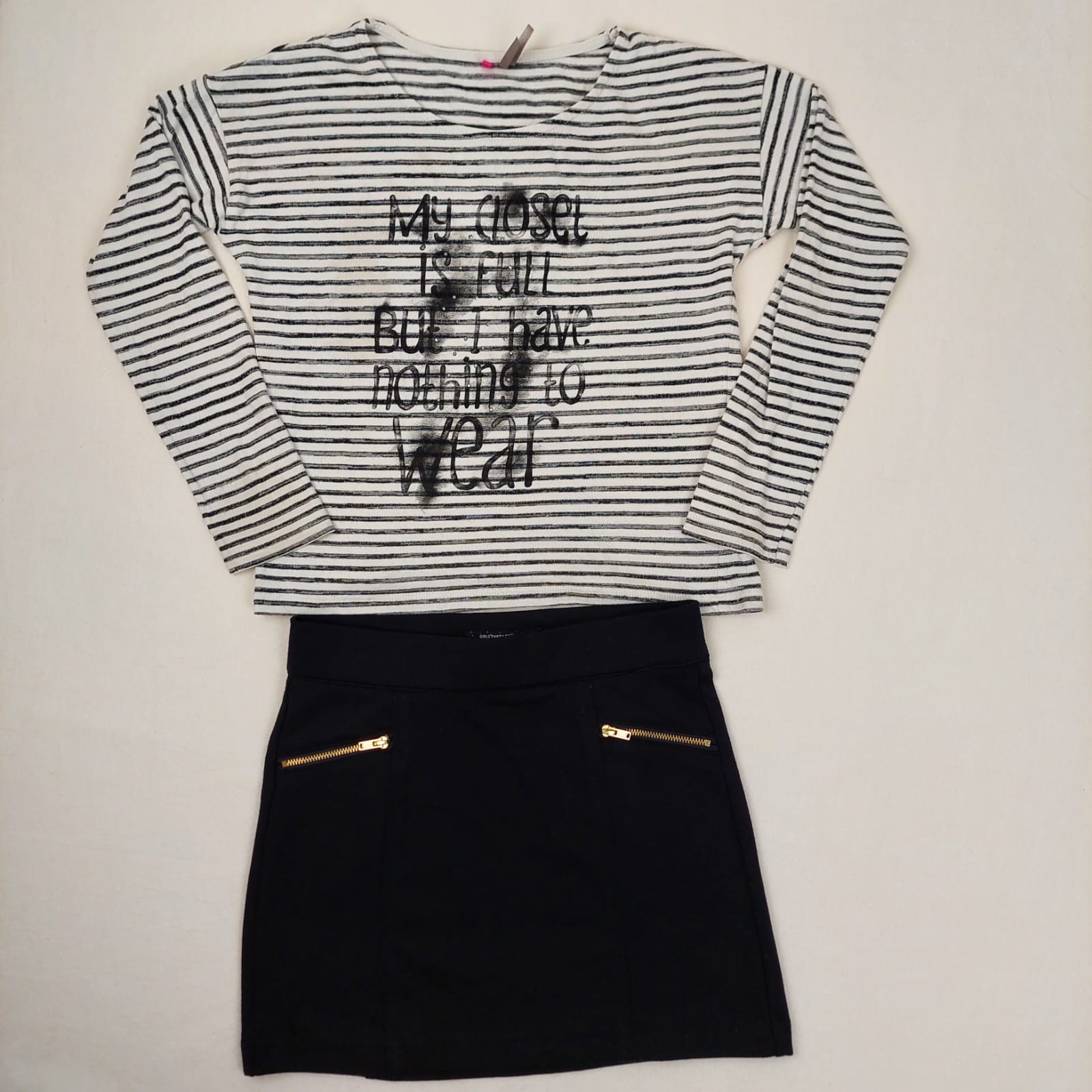 Autres commentaires : T-shirt manches longues Orchestra rayé noir et blanc, imprimé « My closet is full but I have nothing to wear », jupe A-line C&A noir, zips à l’avant