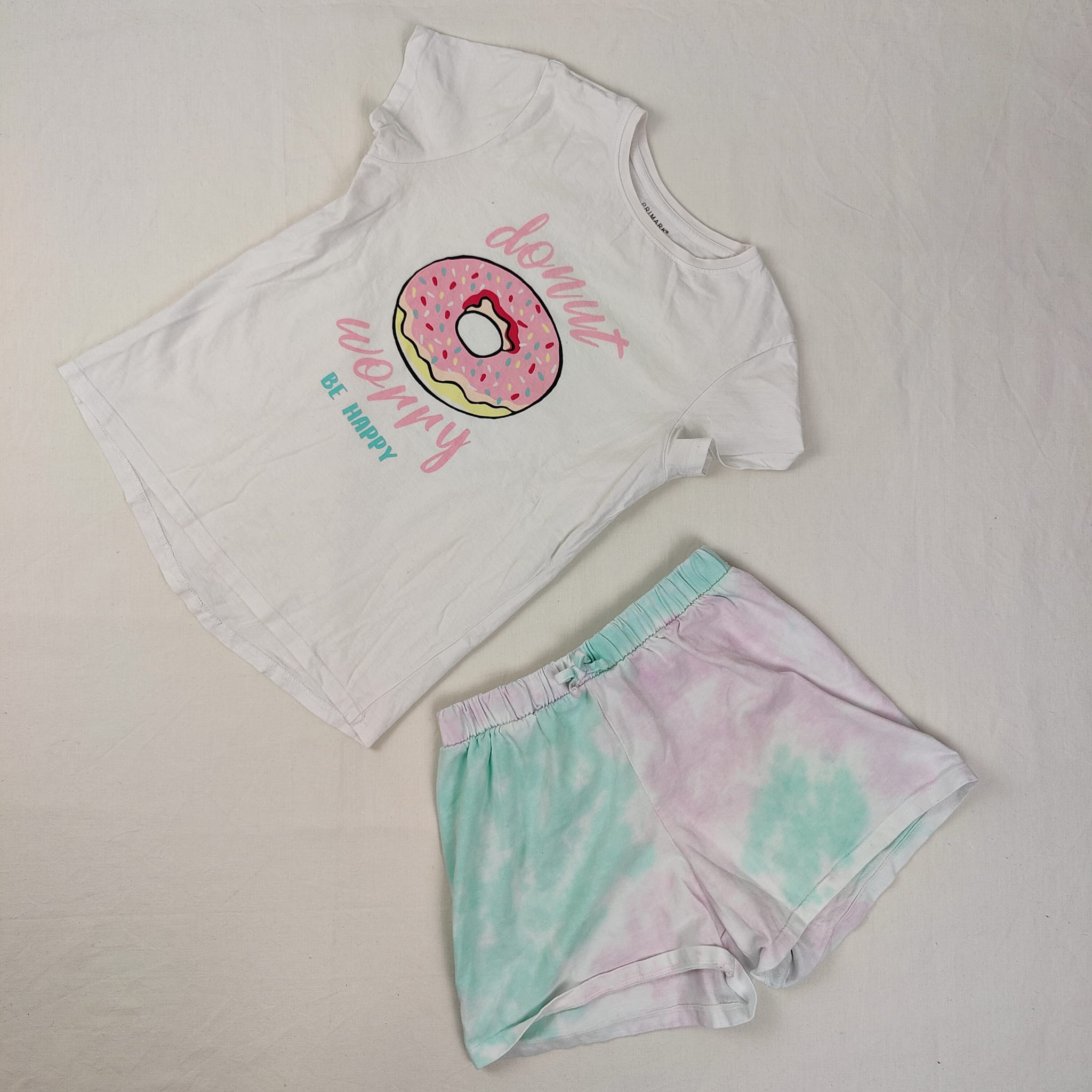 Autres commentaires : T-shirt imprimé Donut , écriture Donut worry BE HAPPY, Short teinté blue turquoise et rose