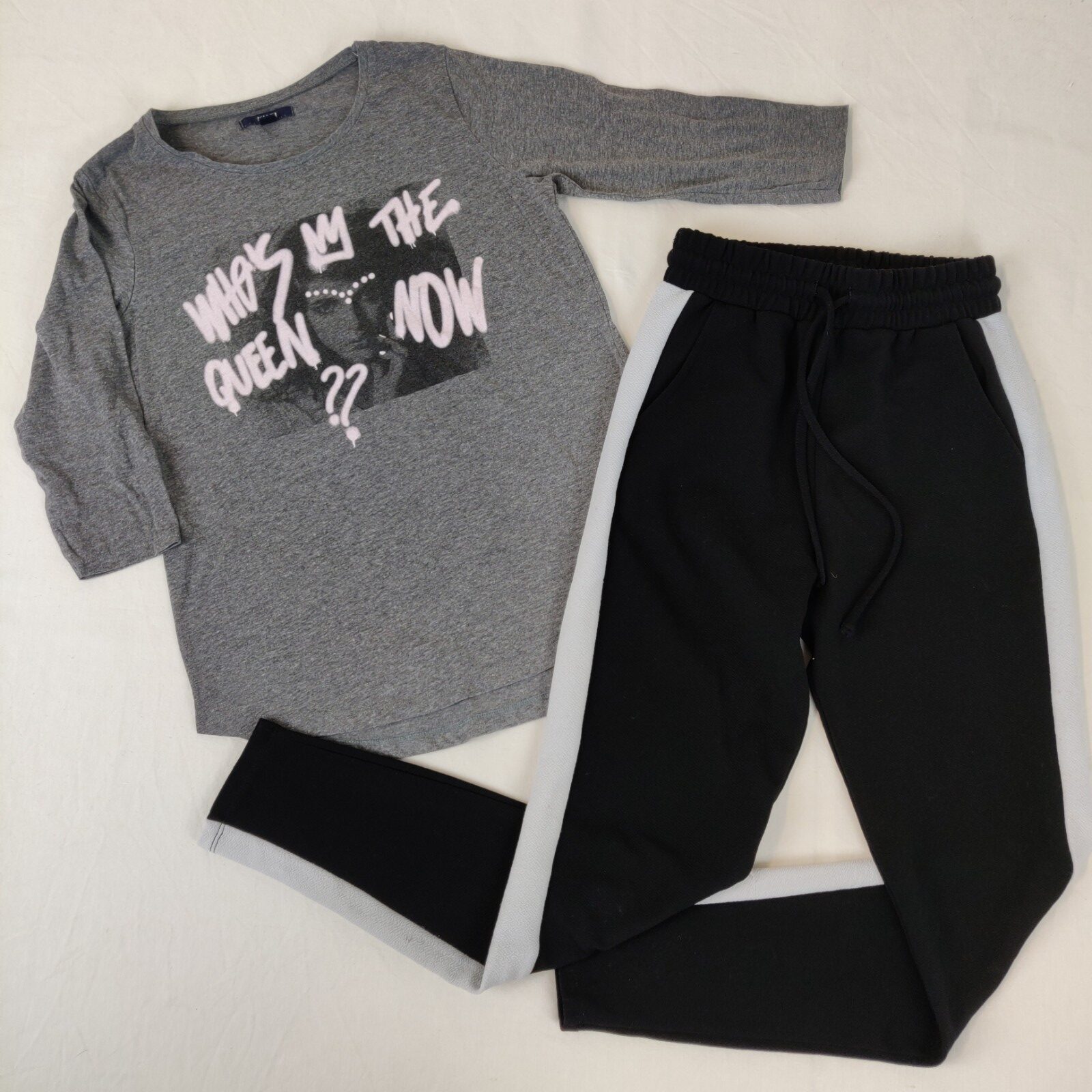 Autres commentaires : 2% élasthanne. Ensemble 2 pièces. Un t-shirt à manches longues Kiabi – gris chiné. Inscription centrale rose « Who’s the queen now?? ». Un pantalon Jennyfer noir avec une bande latérale blanche. Taille élastique avec cordon interne noir. 2 poches arrières en trompe-l’oeil. Usure normale.