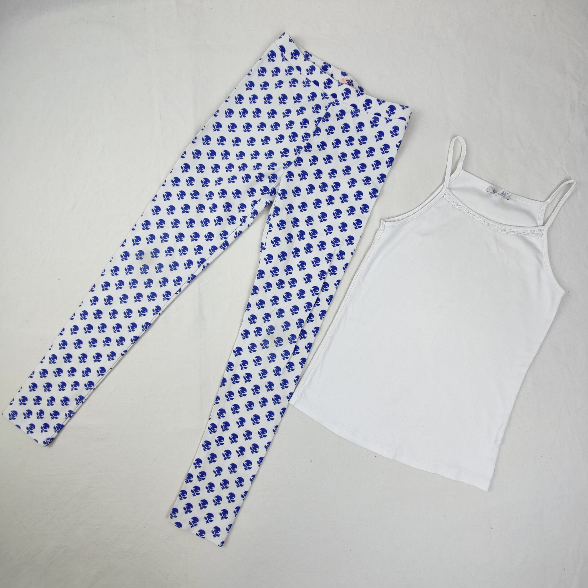 Autres commentaires : Debardeur blanc Okaïdi 100% coton cole avec volant, Leggins crewcuts à motif bleu legère usure genoux