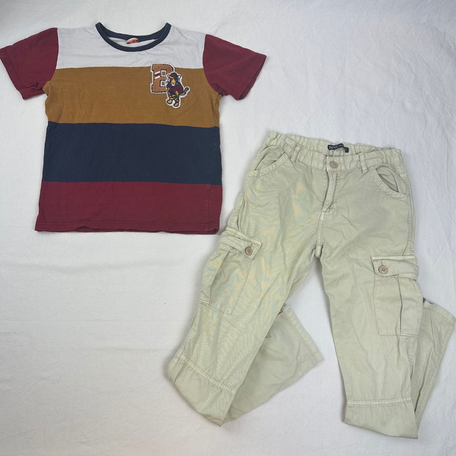 Autres commentaires : T-shirt Tape à l’oeil manches courtes rouge,blanc, marron, et bleu à rayures avec motif un lionceau. Pantalon NPO junior jaune avec taille élastiquée et ceinturée. Petit défaut: petite tâche bleu sur la devanture à gauche du pantalon.