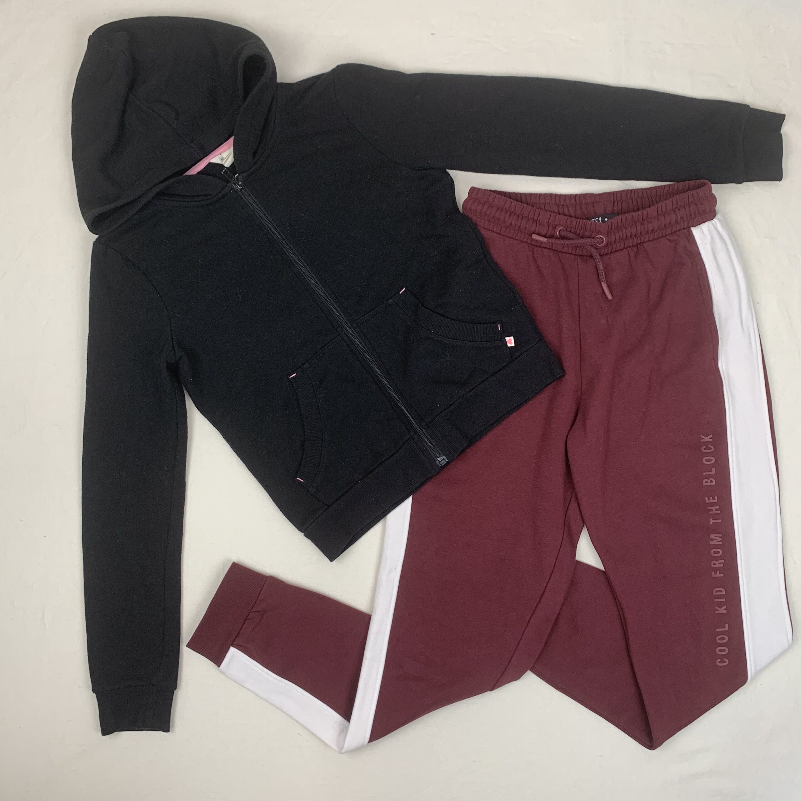 Autres commentaires : Ensemble 2 pièces 12A composé d’un pantalon de jogging violet avec bandes blanches taille élastiquée réglable avec lacet de serrage TEX et d’un Sweat à capuche noir zippé H&M noir avec fermeture éclaire avant