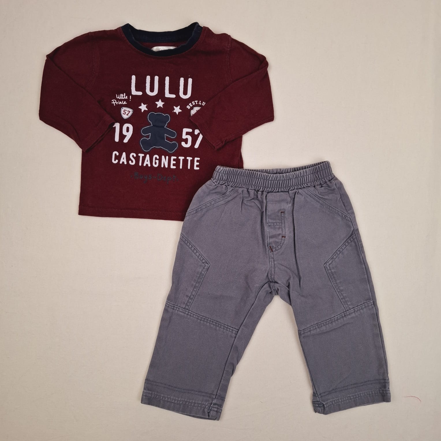 Autres commentaires : Ensemble 2 pièces 12 M composé d’un T-shirt manches longues Lulu castagnette bordeaux avec inscription blanches et un pantalon long gris taille élastiquée P’tit bisous