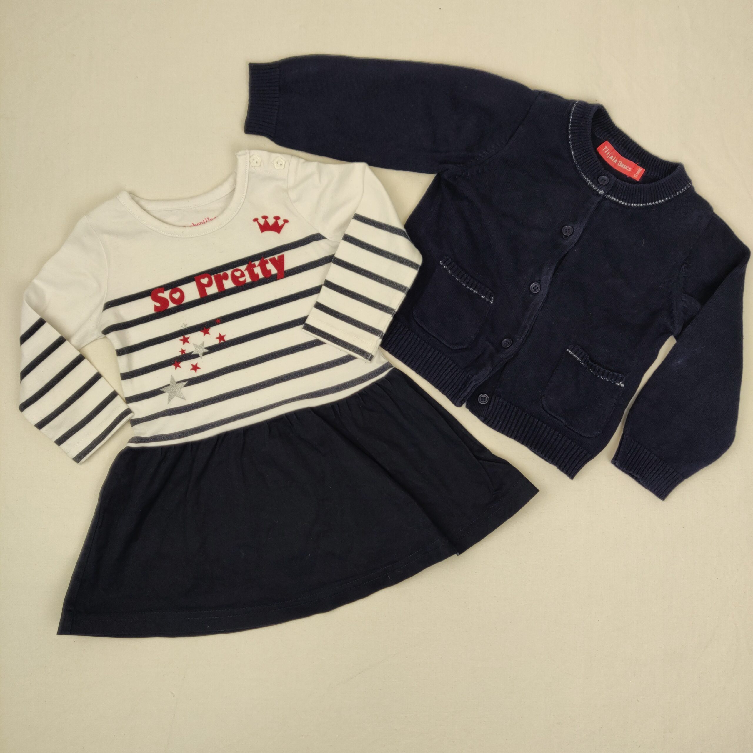 Autres commentaires : Ensemble 2 pièces :- – Robe Barbouillage manches longues, blanche à rayures bleu foncé, partie jupe en couleur bleu nuit unie, fermeture à l’épaule par petits boutons. – Gilet cardigan Tissaia en maille bleu marine avec liseré argenté au niveau du col rond côtelé et des poches.