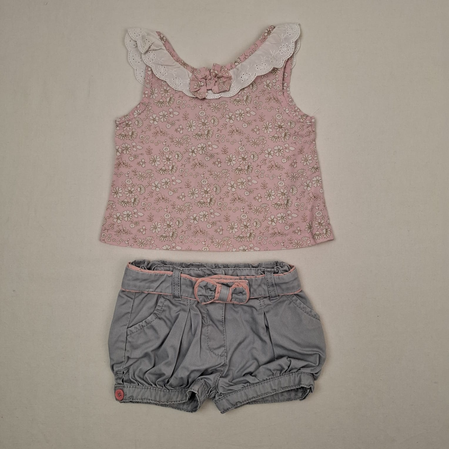 Autres commentaires : Ensemble 2 pièces : – Une robe newness rose avec des motifs de fleurs et de la dentelle au niveau du col, pas de manches, fermeture par bouton au dos, – Un short gris avec une ceinture, fermeture par boutons pressions pour la ceinture, fermeture par boutons pour le short