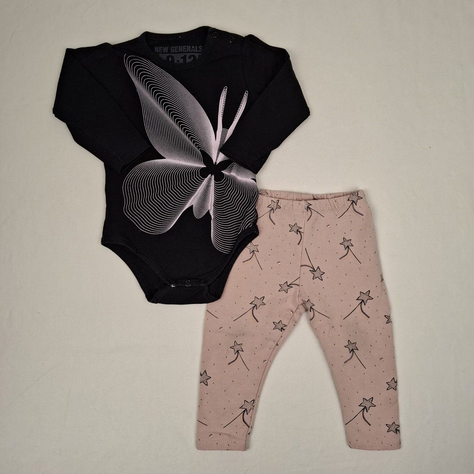 Autres commentaires : Ensemble 2 pièces : – Jeggings Zara, beige rosé parsémés de baguettes magiques et de points noirs et multicolores, taille élastiquée, 96% coton et 4% élasthanne. – Body noir manches longues New Generals, motif papillon rose clair stylisé, fermeture par bouton pression à l’épaule, 100% coton bio