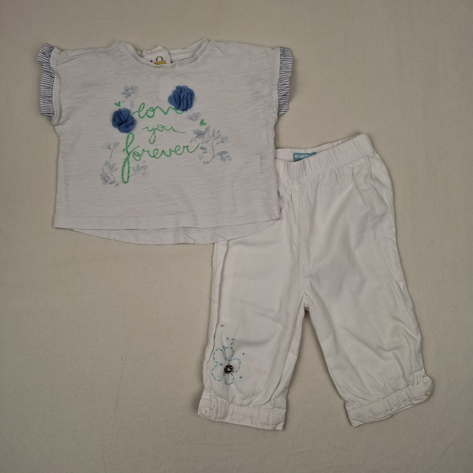 Autres commentaires : Ensemble 2 pièces : – T-shirt sans manches blanc Chicco volanté aux épaules avec un tissu blanc à rayures bleues , fermeture en haut du dos par boutons pression, devant motif floral avec fleurs bleues en relief et inscription en vert prairie scintillant « love you forever ». – Pantalon léger blanc Orchestra, fermeture aux chevilles par bouton, taille élastiquée, motif fleur en bas de la jambe droite.