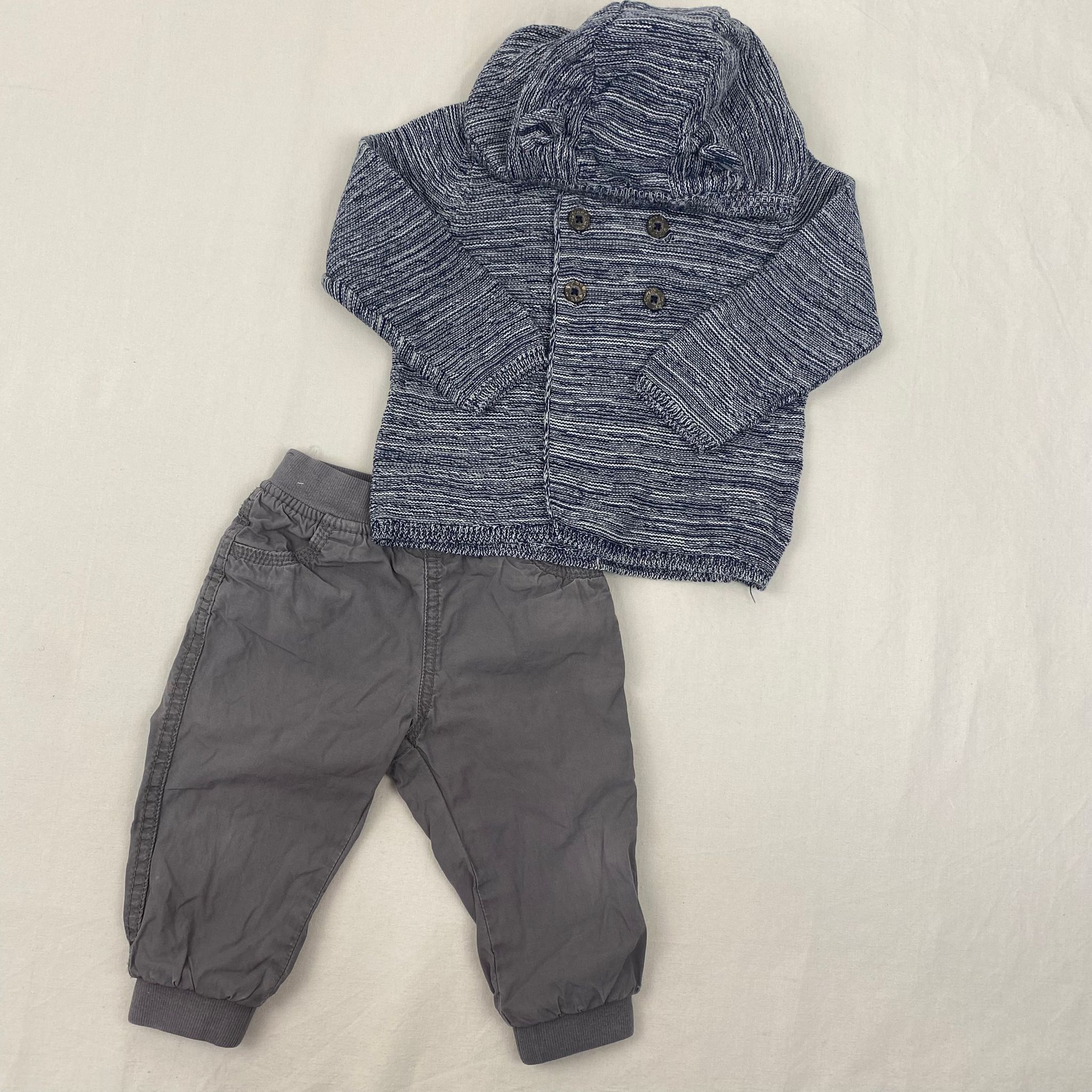Autres commentaires : Ensemble : gilet bleu et blanc à boutons, et pantalon gris avec ceinture élastique ajustable à la taille.