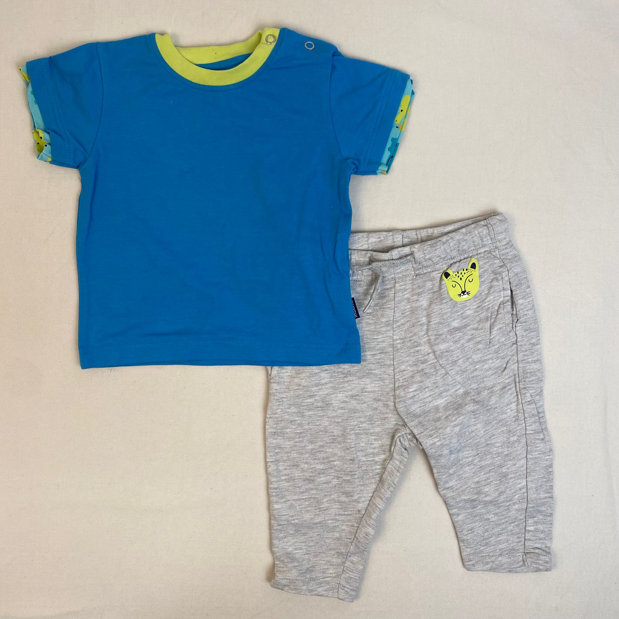 5% élasthanne pour le t-shirt, 2% viscose pour le bas, Ensemble 2 pièces : – Un t-shirt bleu uni avec les bords jaune, col rond, fermeture par boutons pressions au niveau de l’épaule gauche, – un pantalon gémo gris avec un motif de léopard