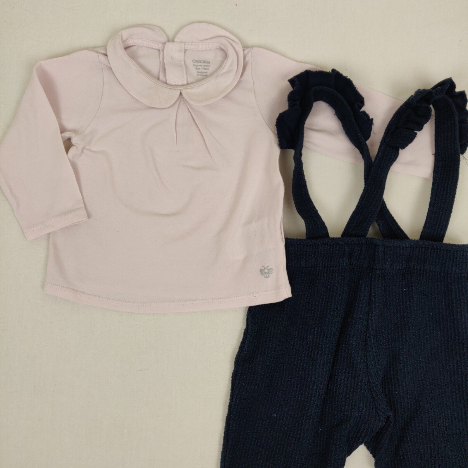 Autres commentaires : 5% elasthanne. T-shirt Obaibi manches longues rose, col claudine et une fermeture au dos par boutons. Salopette Kiabi bleu foncé avec une fermeture à la taille par boutons pressions.